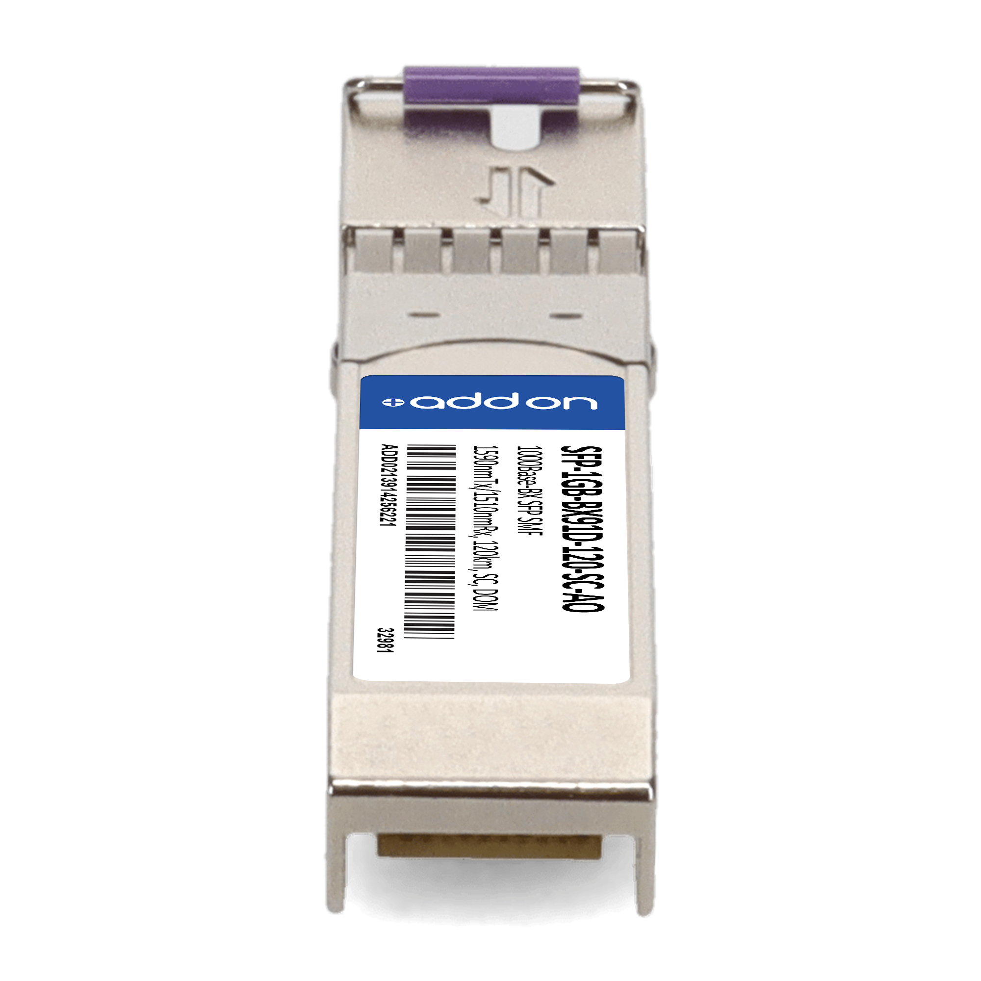 AddOn Networks SFP-1GB-BX91D-120-SC-AO. SFP transceiver type: Fiber optic, Maximum data transfer rate: 1000 Mbit/s, Interface type: SFP. Product colour: Silver, Brand compatibility: MSA Compliant. Compliance certificates: Trade Agreements Act (TAA). Quantity per pack: 1 pc(s). Package width: 69.8 mm, Package depth: 120.6 mm, Package height: 30.5 mm |