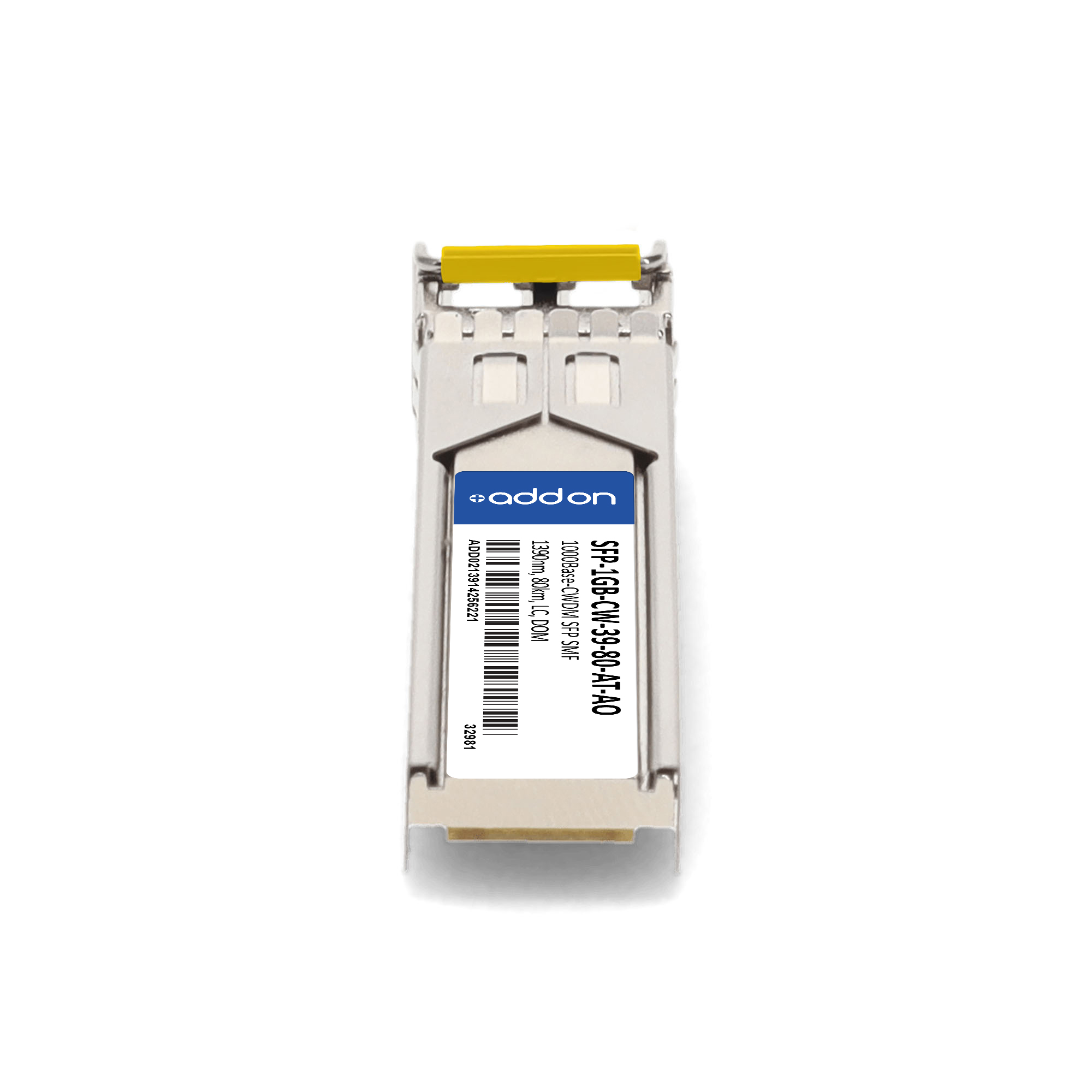 AddOn Networks SFP-1GB-CW-39-80-AT-AO. SFP transceiver type: Fiber optic, Maximum data transfer rate: 1000 Mbit/s, Interface type: SFP. Product colour: Silver, Brand compatibility: Adtran. Compliance certificates: Trade Agreements Act (TAA). Quantity per pack: 1 pc(s). Package width: 69.8 mm, Package depth: 120.6 mm, Package height: 30.5 mm |