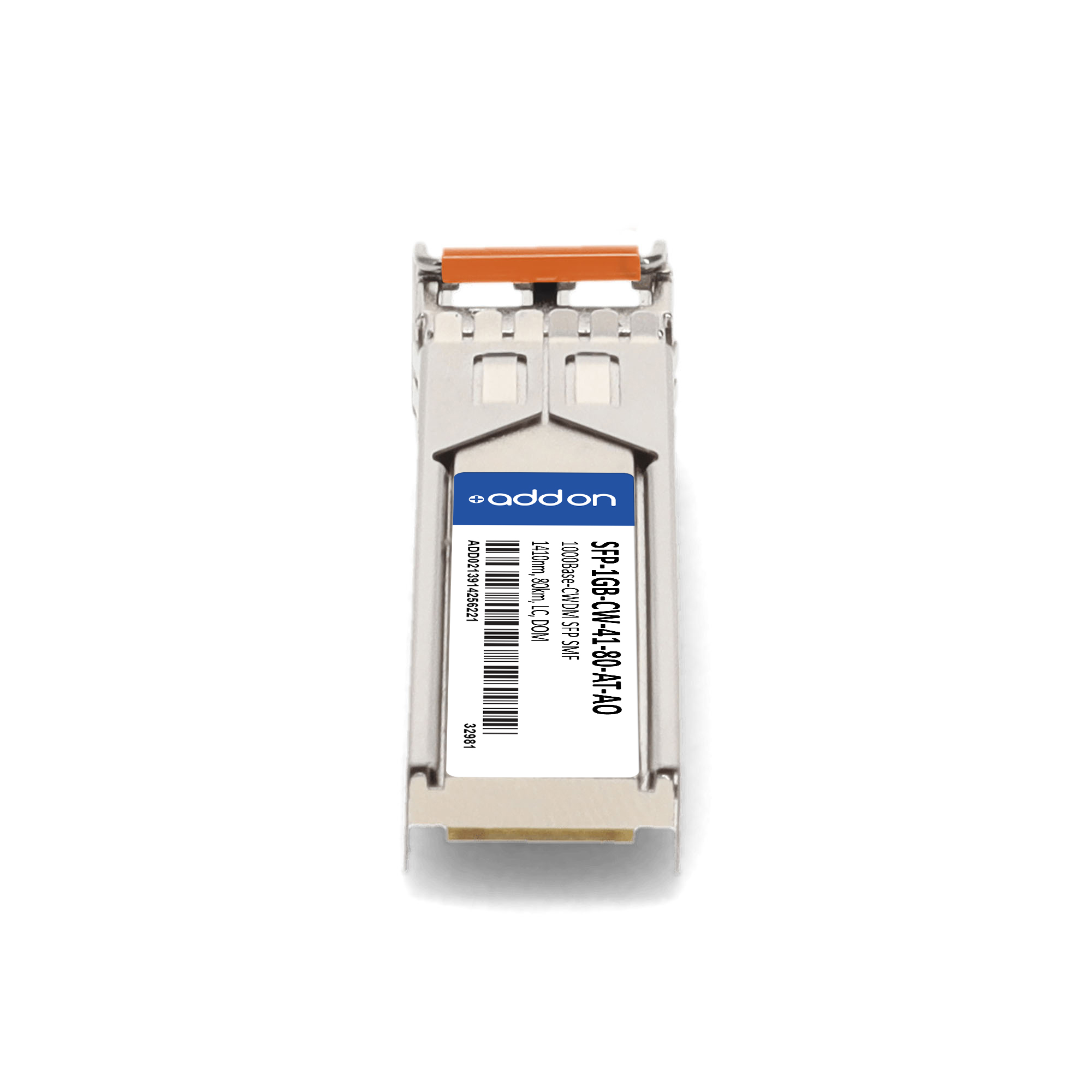 AddOn Networks SFP-1GB-CW-41-80-AT-AO. SFP transceiver type: Fiber optic, Maximum data transfer rate: 1000 Mbit/s, Interface type: SFP. Product colour: Silver, Brand compatibility: Adtran. Compliance certificates: Trade Agreements Act (TAA). Quantity per pack: 1 pc(s). Package width: 69.8 mm, Package depth: 120.6 mm, Package height: 30.5 mm |