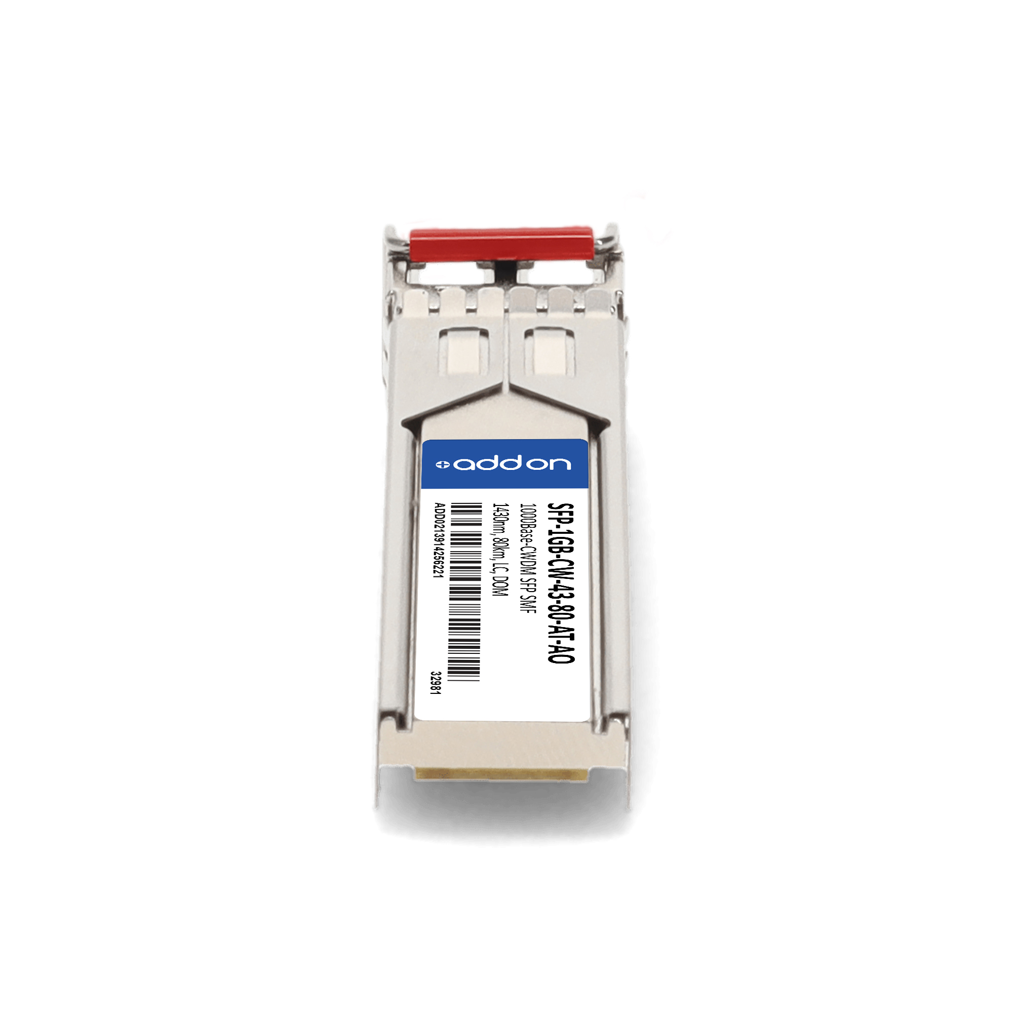AddOn Networks SFP-1GB-CW-43-80-AT-AO. SFP transceiver type: Fiber optic, Maximum data transfer rate: 1000 Mbit/s, Interface type: SFP. Product colour: Silver, Brand compatibility: Adtran. Compliance certificates: Trade Agreements Act (TAA). Quantity per pack: 1 pc(s). Package width: 69.8 mm, Package depth: 120.6 mm, Package height: 30.5 mm |