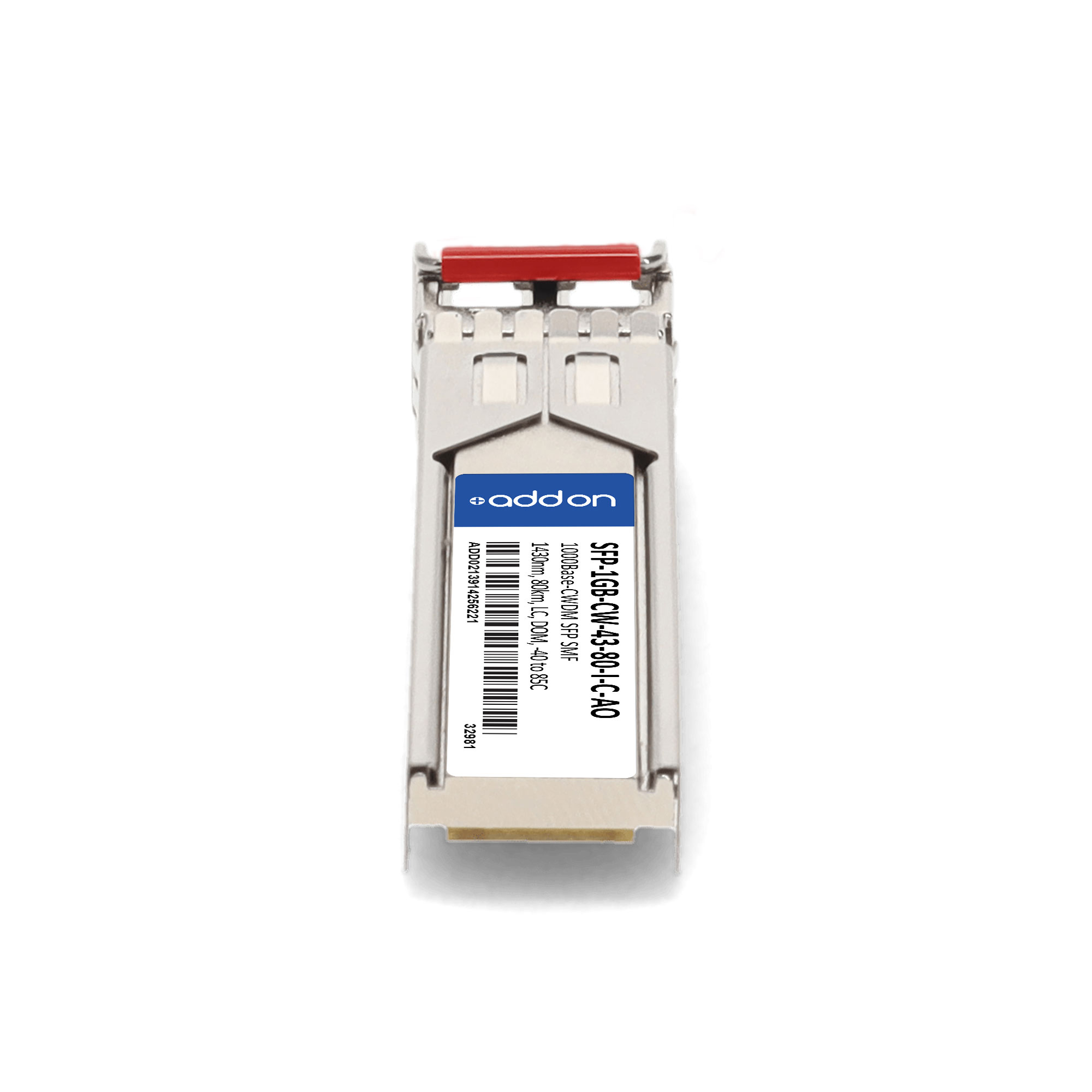 AddOn Networks SFP-1GB-CW-43-80-I-C-AO. SFP transceiver type: Fiber optic, Maximum data transfer rate: 1000 Mbit/s, Interface type: SFP. Product colour: Silver, Brand compatibility: Cisco. Compliance certificates: Trade Agreements Act (TAA). Quantity per pack: 1 pc(s). Package width: 69.8 mm, Package depth: 120.6 mm, Package height: 30.5 mm |