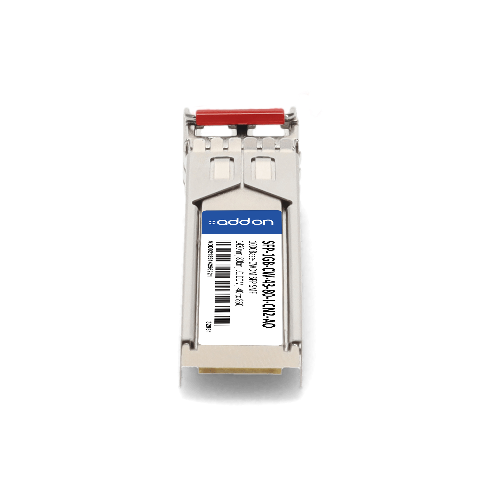 AddOn Networks SFP-1GB-CW-43-80-I-CN2-AO. SFP transceiver type: Fiber optic, Maximum data transfer rate: 1000 Mbit/s, Interface type: SFP. Product colour: Silver, Brand compatibility: Ciena. Compliance certificates: Trade Agreements Act (TAA). Quantity per pack: 1 pc(s). Package width: 69.8 mm, Package depth: 120.6 mm, Package height: 30.5 mm |