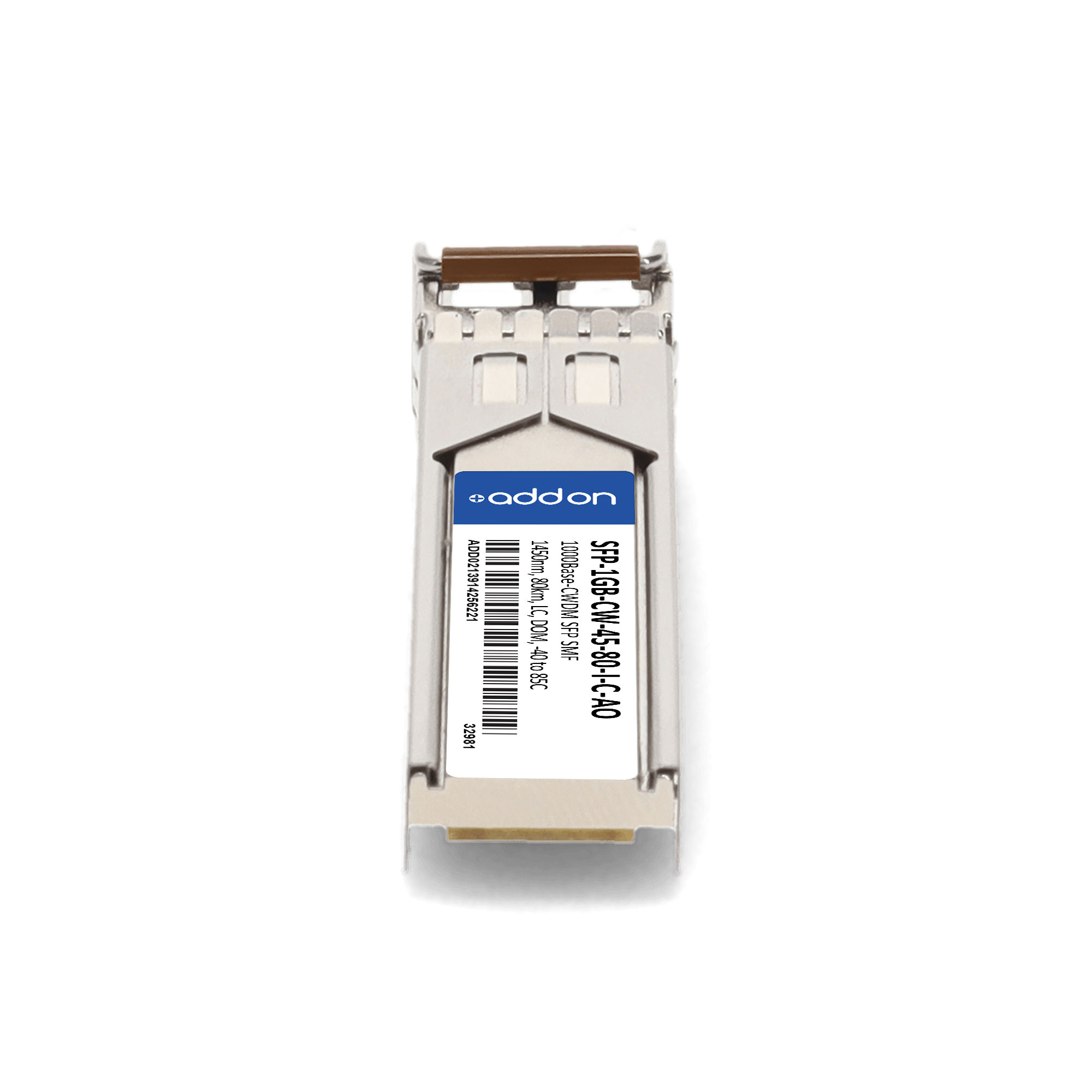 AddOn Networks SFP-1GB-CW-45-80-I-C-AO. SFP transceiver type: Fiber optic, Maximum data transfer rate: 1000 Mbit/s, Interface type: SFP. Product colour: Silver, Brand compatibility: Cisco. Compliance certificates: Trade Agreements Act (TAA). Quantity per pack: 1 pc(s). Package width: 69.8 mm, Package depth: 120.6 mm, Package height: 30.5 mm |