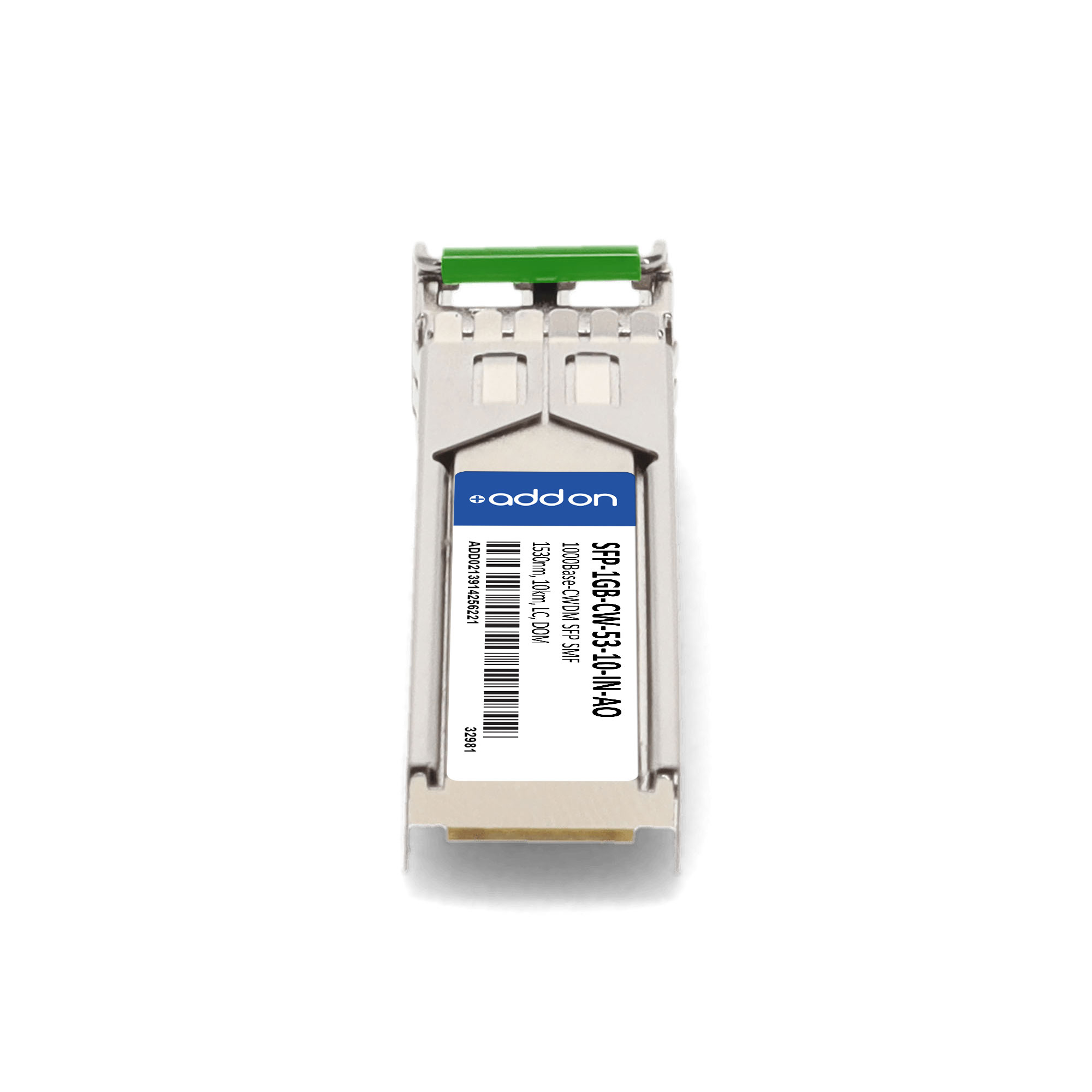 AddOn Networks SFP-1GB-CW-53-10-IN-AO. SFP transceiver type: Fiber optic, Maximum data transfer rate: 1000 Mbit/s, Interface type: SFP. Product colour: Silver, Brand compatibility: Intel. Compliance certificates: Trade Agreements Act (TAA). Quantity per pack: 1 pc(s). Package width: 69.8 mm, Package depth: 120.6 mm, Package height: 30.5 mm |