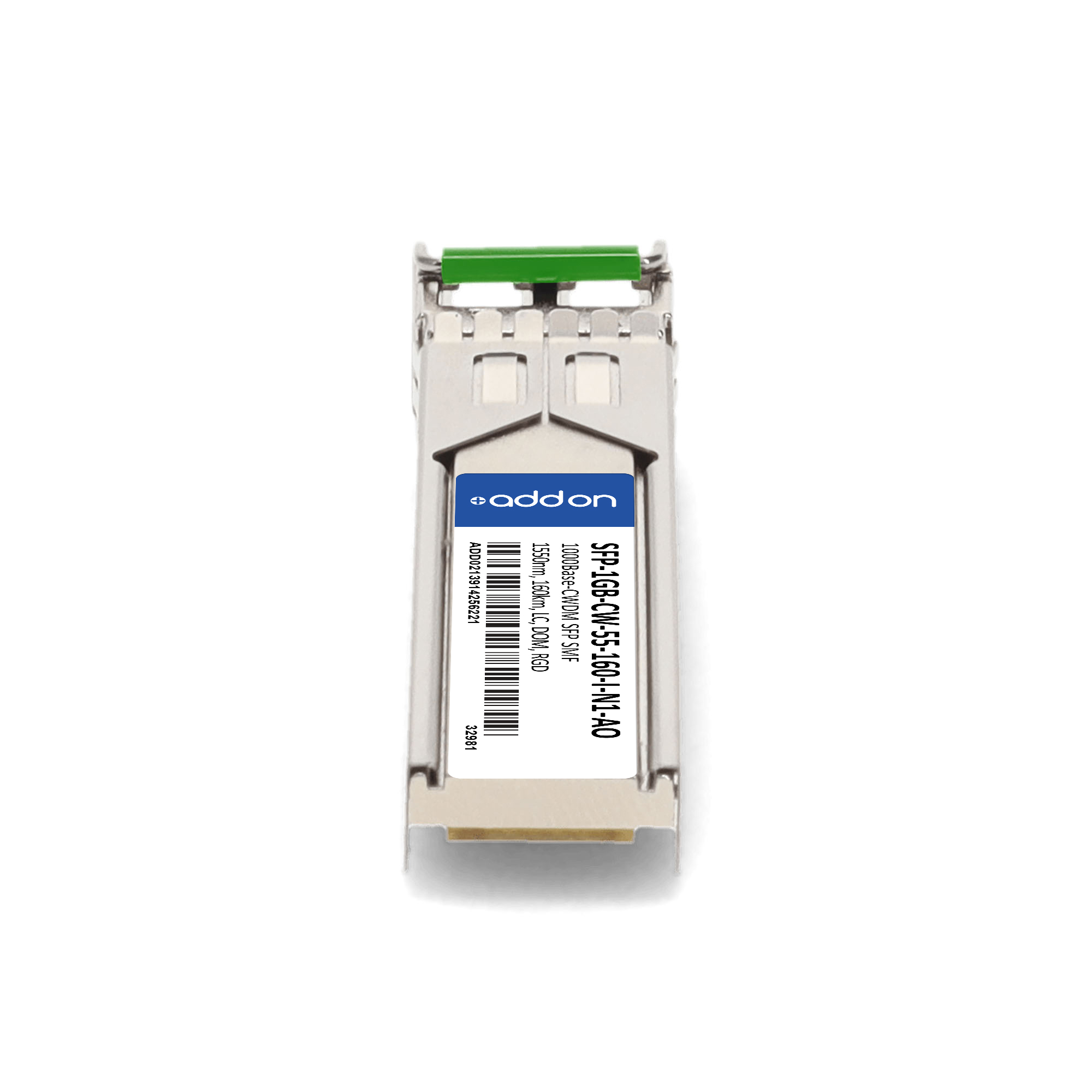 AddOn Networks SFP-1GB-CW-55-160-I-N1-AO. SFP transceiver type: Fiber optic, Maximum data transfer rate: 1000 Mbit/s, Interface type: SFP. Product colour: Silver, Brand compatibility: Alcatel-Lucent / Nokia. Compliance certificates: Trade Agreements Act (TAA). Quantity per pack: 1 pc(s). Package width: 69.8 mm, Package depth: 120.6 mm, Package height: 30.5 mm |