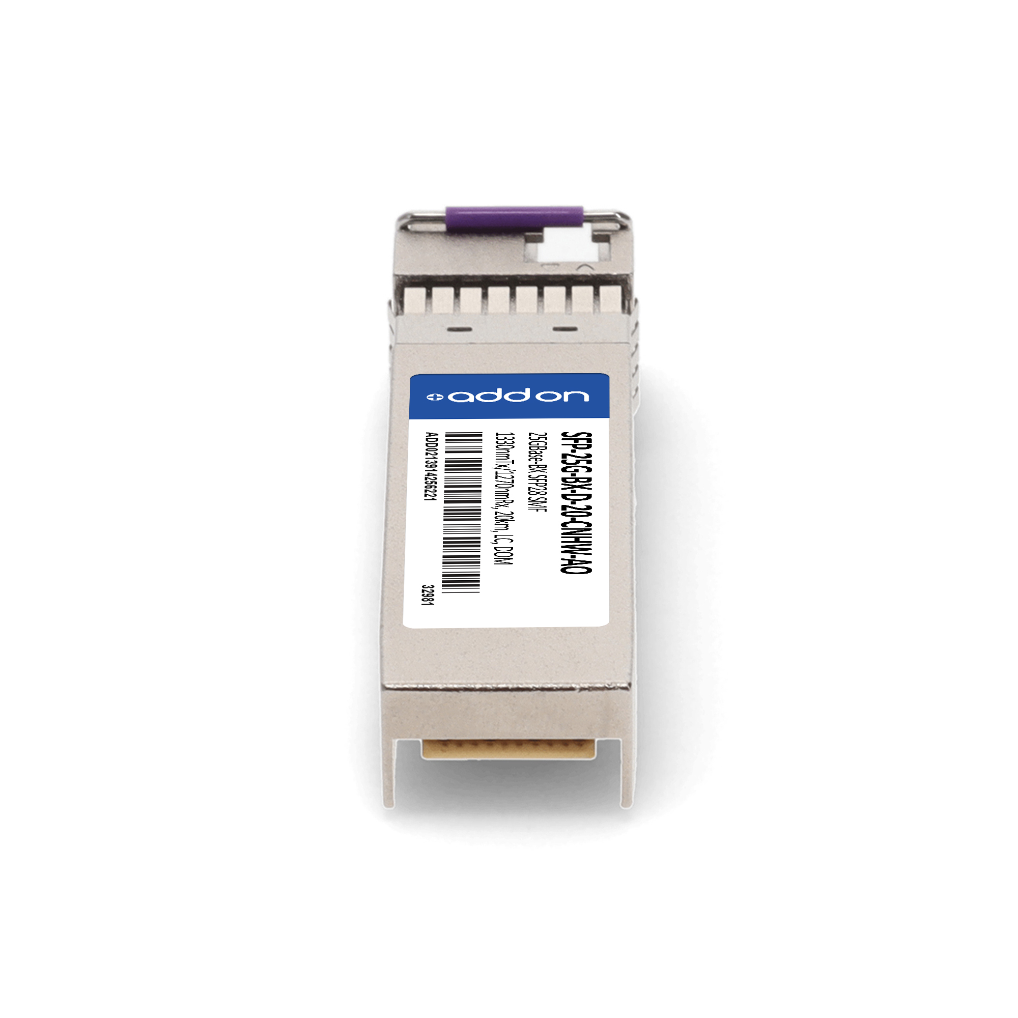 AddOn Networks SFP-25G-BX-D-20-CNHW-AO. SFP transceiver type: Fiber optic, Maximum data transfer rate: 25000 Mbit/s, Interface type: SFP28. Product colour: Silver, Brand compatibility: Cisco. Compliance certificates: Trade Agreements Act (TAA). Quantity per pack: 1 pc(s). Package width: 69.8 mm, Package depth: 120.6 mm, Package height: 30.5 mm |