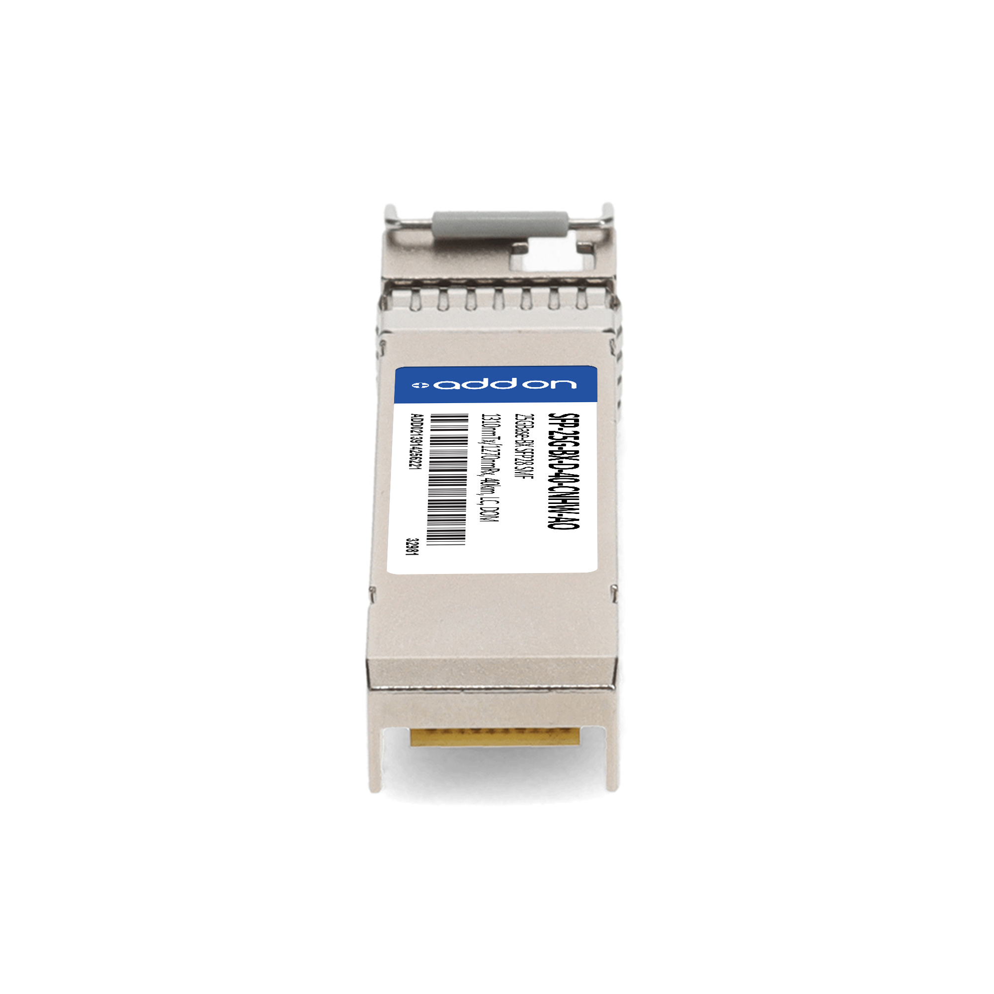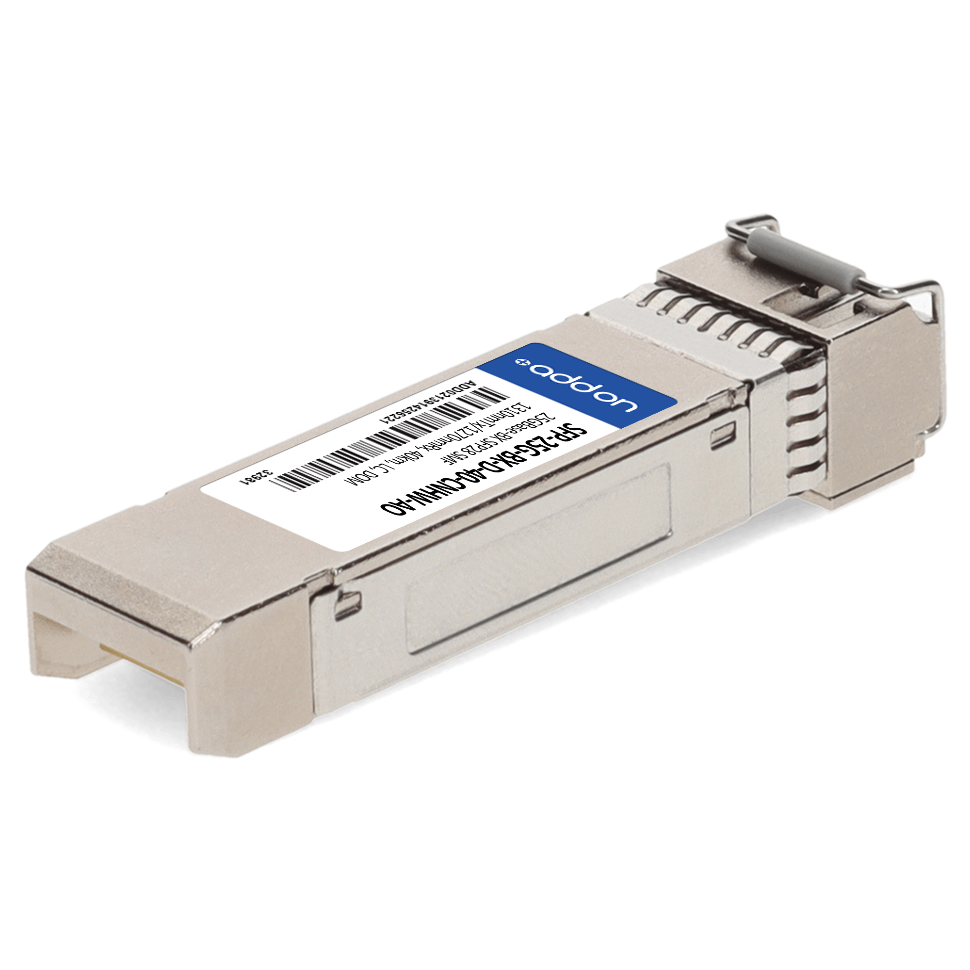 AddOn Networks SFP-25G-BX-D-40-CNHW-AO. SFP transceiver type: Fiber optic, Maximum data transfer rate: 25000 Mbit/s, Interface type: SFP28. Product colour: Silver, Brand compatibility: Cisco. Compliance certificates: Trade Agreements Act (TAA). Quantity per pack: 1 pc(s). Package width: 69.8 mm, Package depth: 120.6 mm, Package height: 30.5 mm |