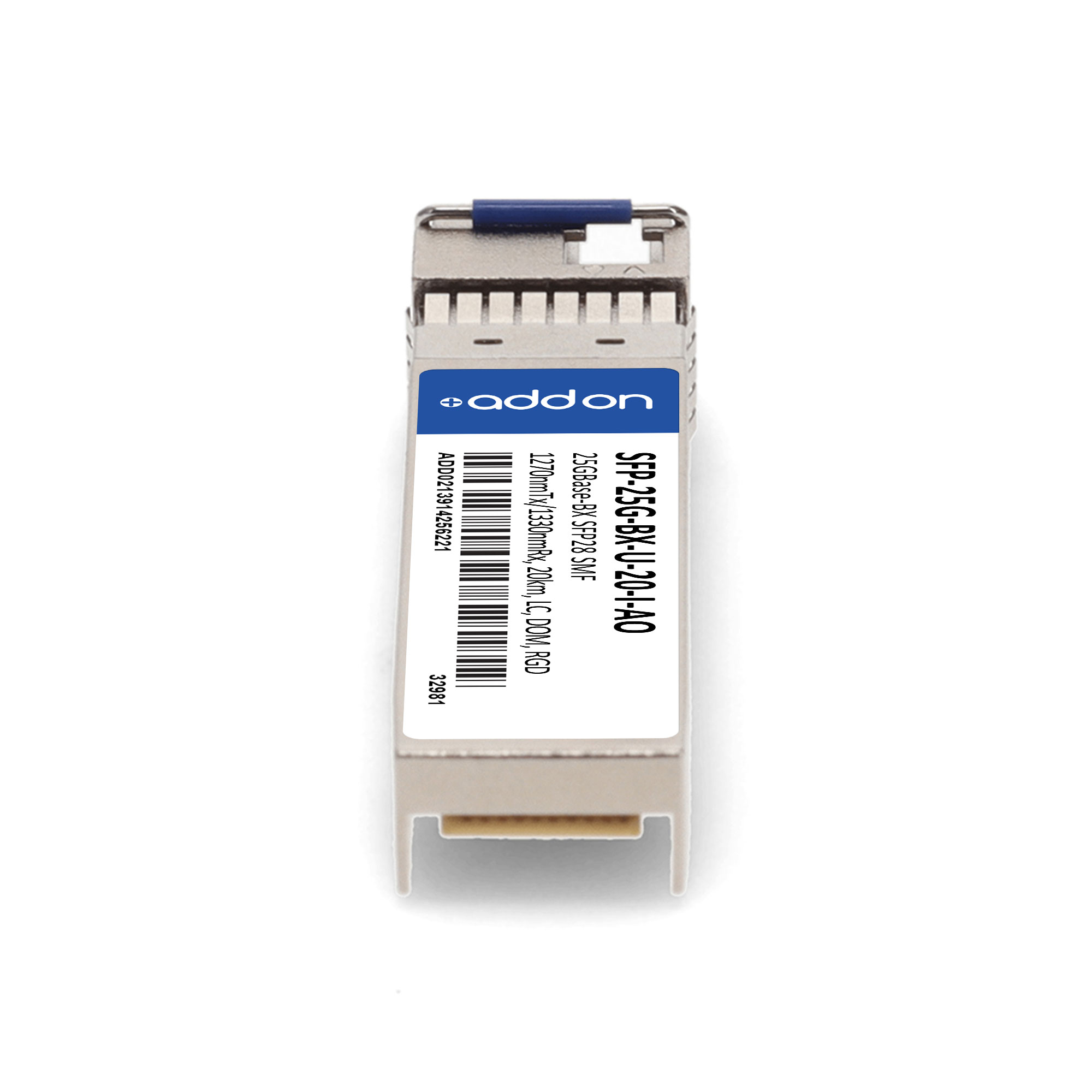 AddOn Networks SFP-25G-BX-U-20-I-AO. SFP transceiver type: Fiber optic, Maximum data transfer rate: 25000 Mbit/s, Interface type: SFP28. Product colour: Silver, Brand compatibility: Cisco. Compliance certificates: Trade Agreements Act (TAA). Quantity per pack: 1 pc(s). Package width: 69.8 mm, Package depth: 120.6 mm, Package height: 30.5 mm |