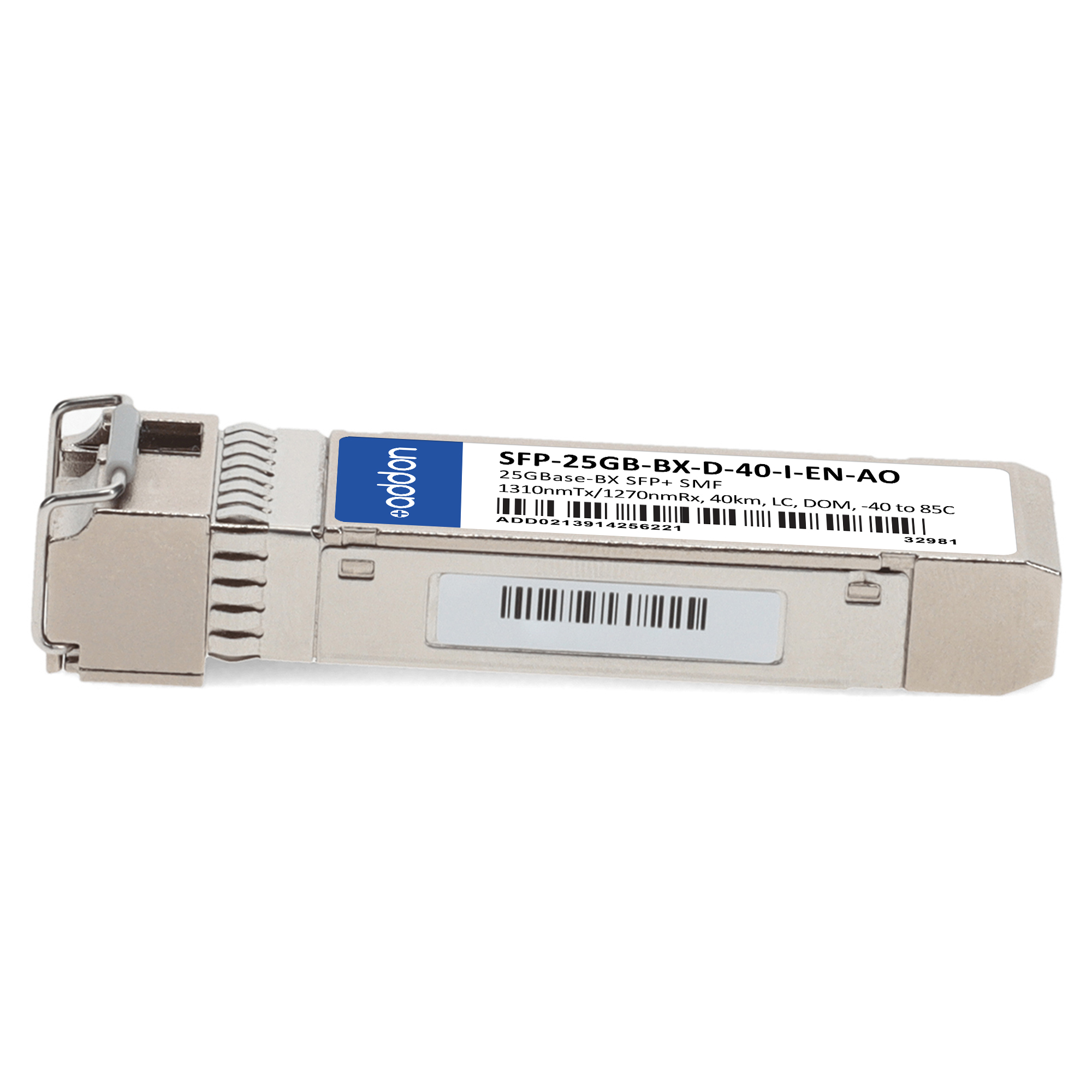 AddOn Networks SFP-25GB-BX-D-40-I-EN-AO. SFP transceiver type: Fiber optic, Maximum data transfer rate: 25000 Mbit/s, Interface type: SFP28. Product colour: Silver, Brand compatibility: LG-Ericsson. Compliance certificates: Trade Agreements Act (TAA). Quantity per pack: 1 pc(s). Package width: 69.8 mm, Package depth: 120.6 mm, Package height: 30.5 mm |