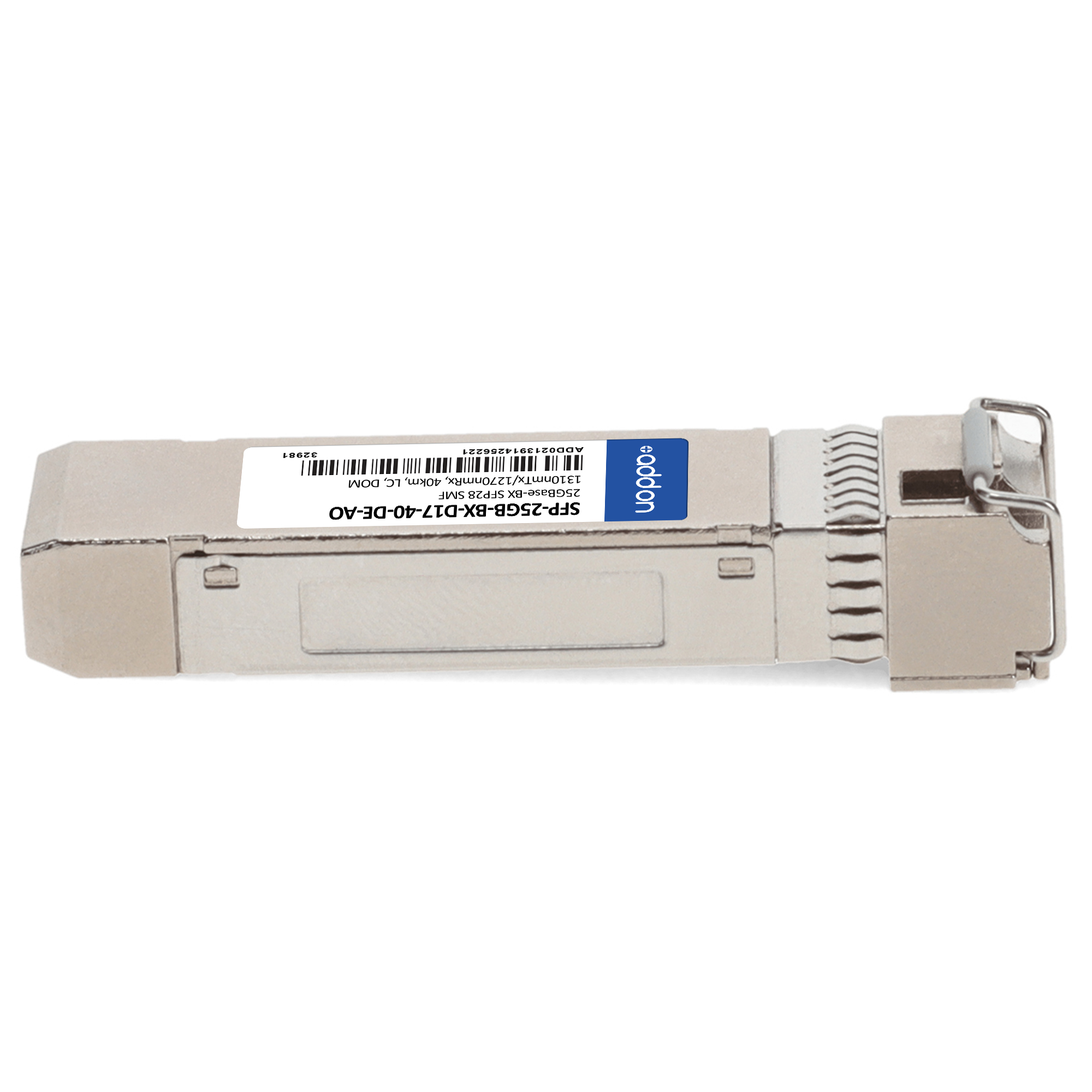 AddOn Networks SFP-25GB-BX-D17-40-DE-AO. SFP transceiver type: Fiber optic, Maximum data transfer rate: 25000 Mbit/s, Interface type: SFP28. Product colour: Silver, Brand compatibility: Dell. Compliance certificates: Trade Agreements Act (TAA). Quantity per pack: 1 pc(s). Package width: 69.8 mm, Package depth: 120.6 mm, Package height: 30.5 mm |