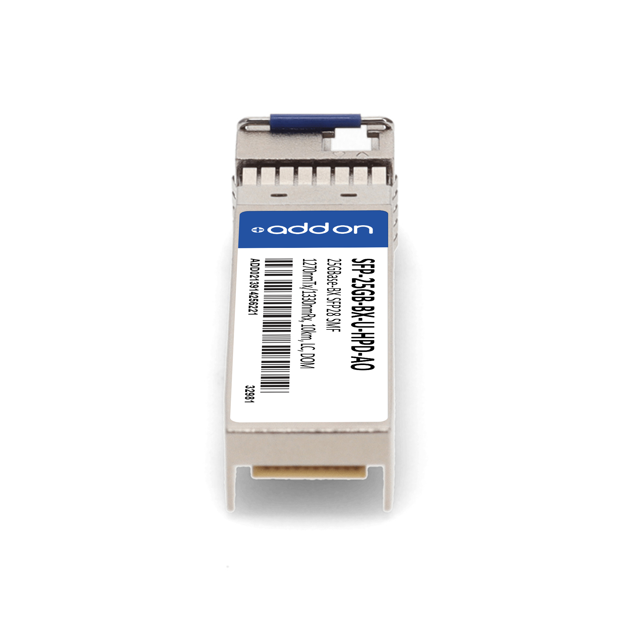 AddOn Networks SFP-25GB-BX-U-HPD-AO. SFP transceiver type: Fiber optic, Maximum data transfer rate: 25000 Mbit/s, Interface type: SFP28. Product colour: Silver, Brand compatibility: HP. Compliance certificates: Trade Agreements Act (TAA). Quantity per pack: 1 pc(s). Package width: 69.8 mm, Package depth: 120.6 mm, Package height: 30.5 mm |