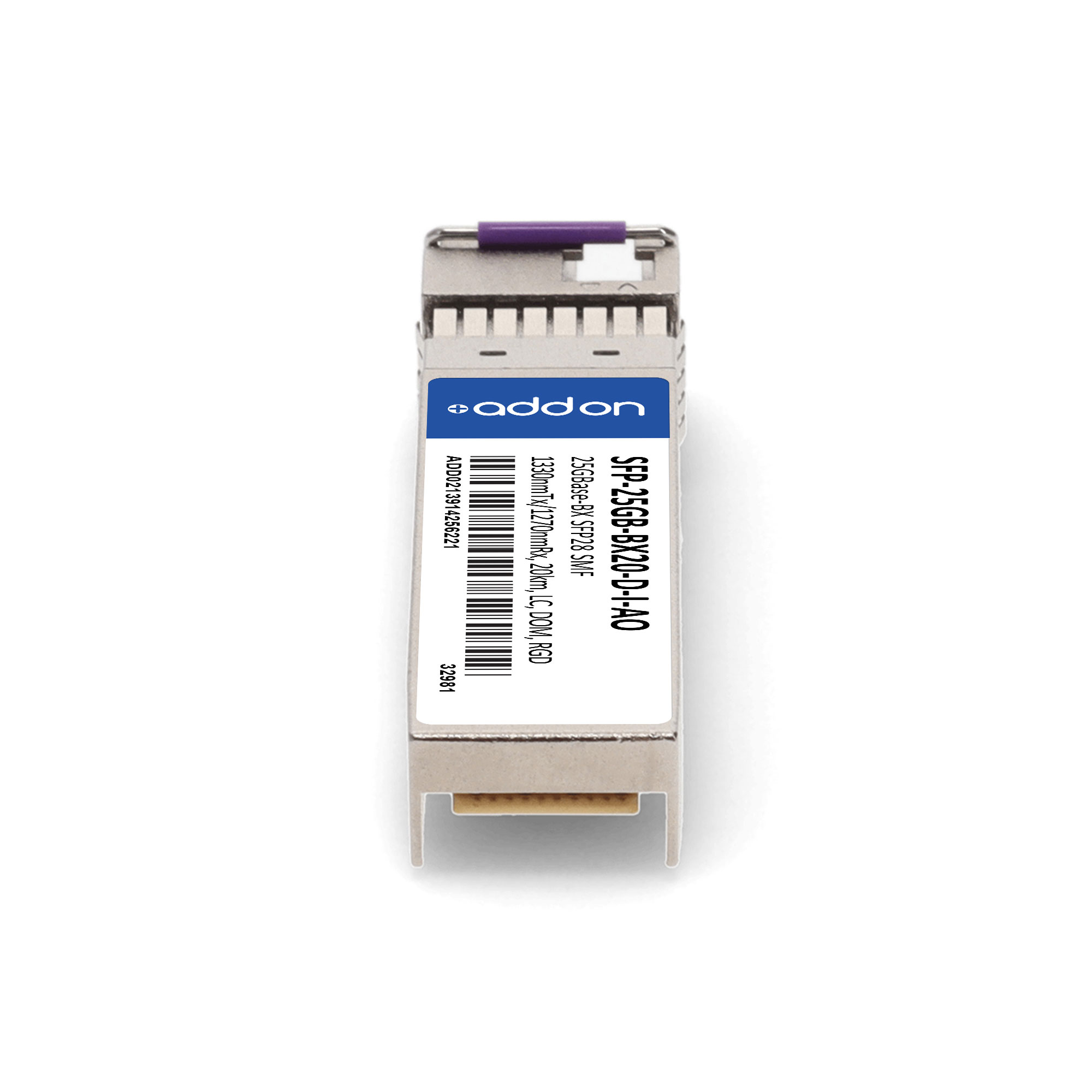 AddOn Networks SFP-25GB-BX20-D-I-AO. SFP transceiver type: Fiber optic, Maximum data transfer rate: 25000 Mbit/s, Interface type: SFP28. Product colour: Silver, Brand compatibility: MSA Compliant. Compliance certificates: Trade Agreements Act (TAA). Quantity per pack: 1 pc(s). Package width: 69.8 mm, Package depth: 120.6 mm, Package height: 30.5 mm |