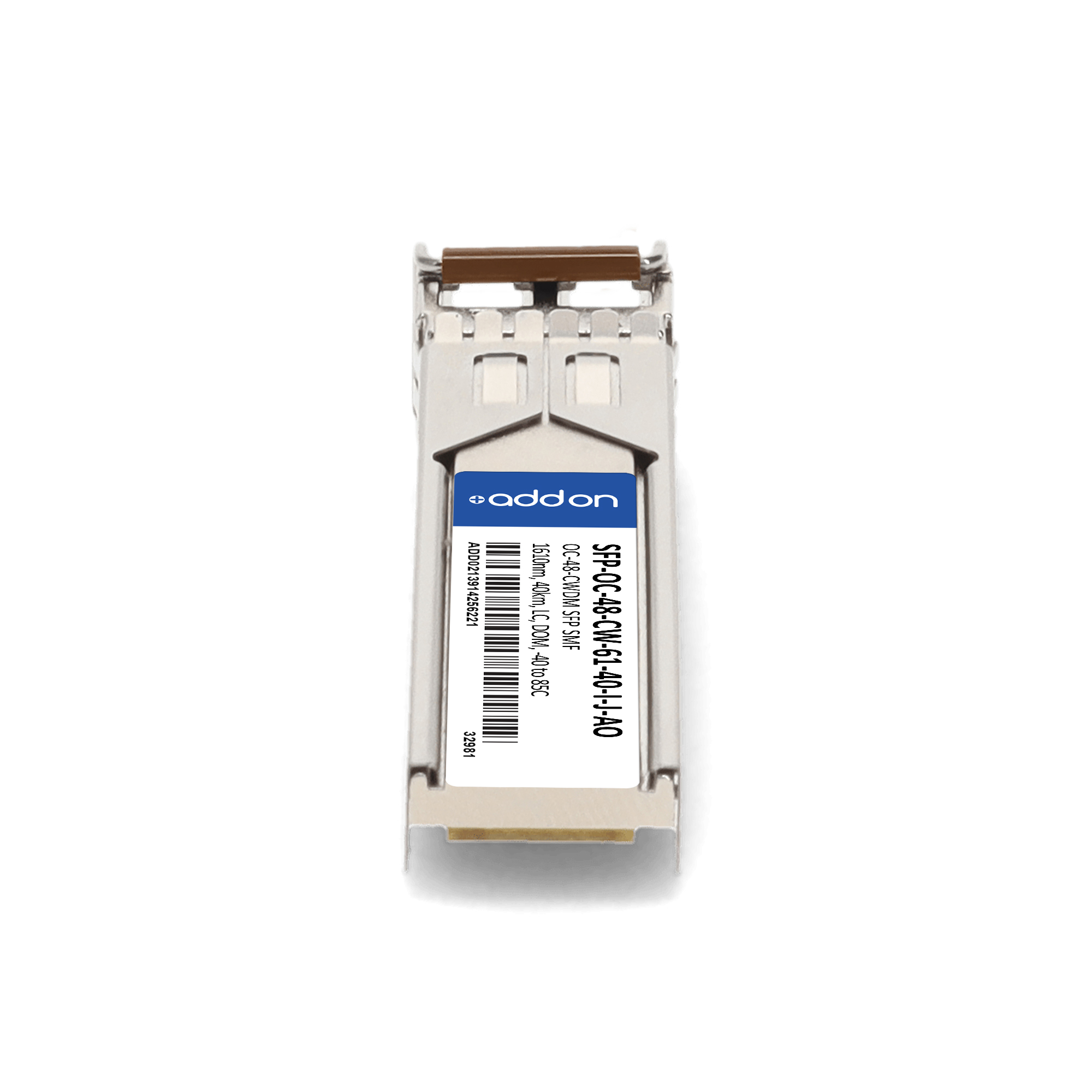 AddOn Networks SFP-OC-48-CW-61-40-I-J-AO. SFP transceiver type: Fiber optic, Maximum data transfer rate: 40000 Mbit/s, Interface type: SFP. Product colour: Silver, Brand compatibility: Juniper. Compliance certificates: Trade Agreements Act (TAA). Quantity per pack: 1 pc(s). Package width: 69.8 mm, Package depth: 120.6 mm, Package height: 30.5 mm |