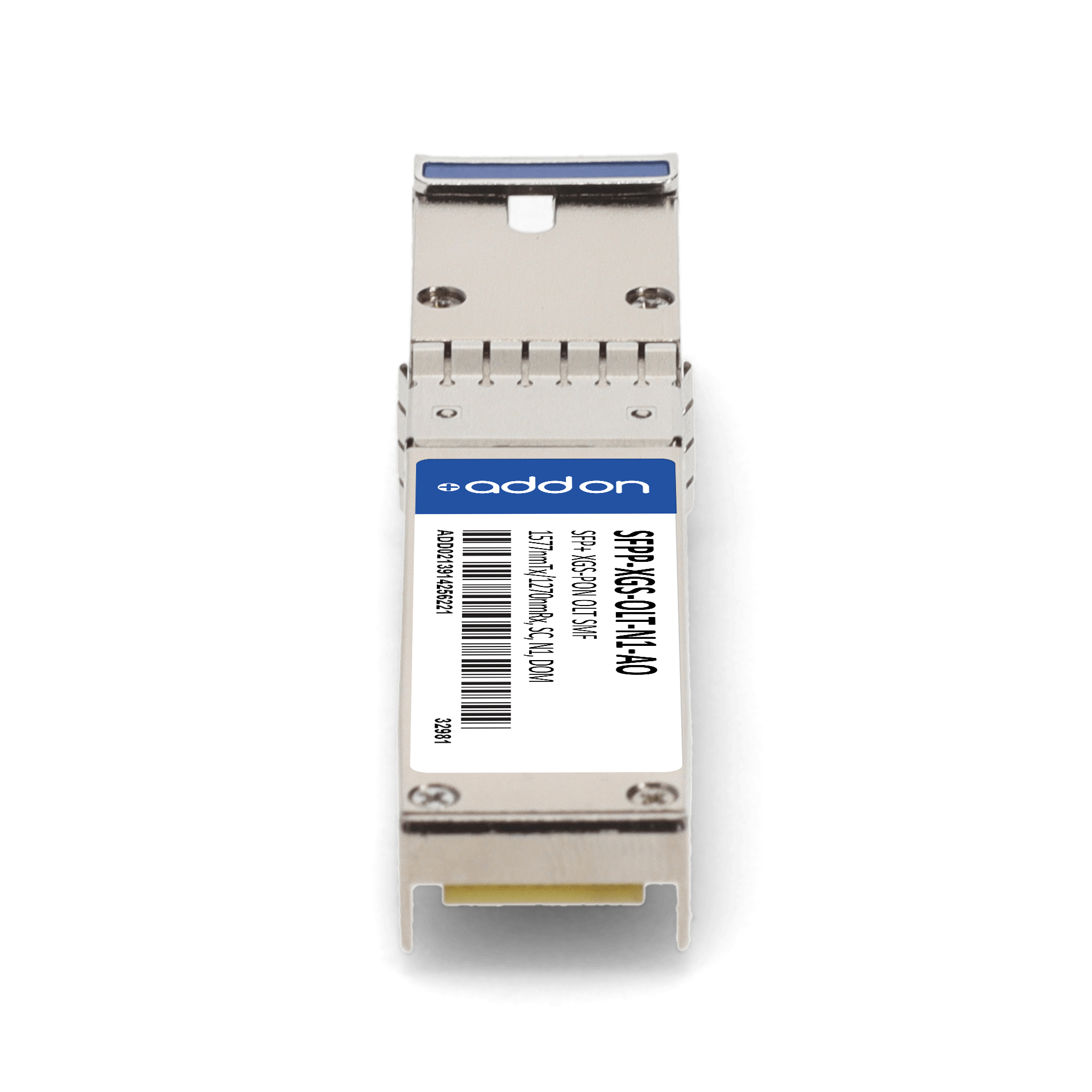 AddOn Networks SFPP-XGS-OLT-N1-AO. SFP transceiver type: Fiber optic, Maximum data transfer rate: 10000 Mbit/s, Interface type: SFP+. Product colour: Silver, Brand compatibility: MSA Compliant. Compliance certificates: Trade Agreements Act (TAA). Quantity per pack: 1 pc(s). Package width: 69.8 mm, Package depth: 120.6 mm, Package height: 30.5 mm |