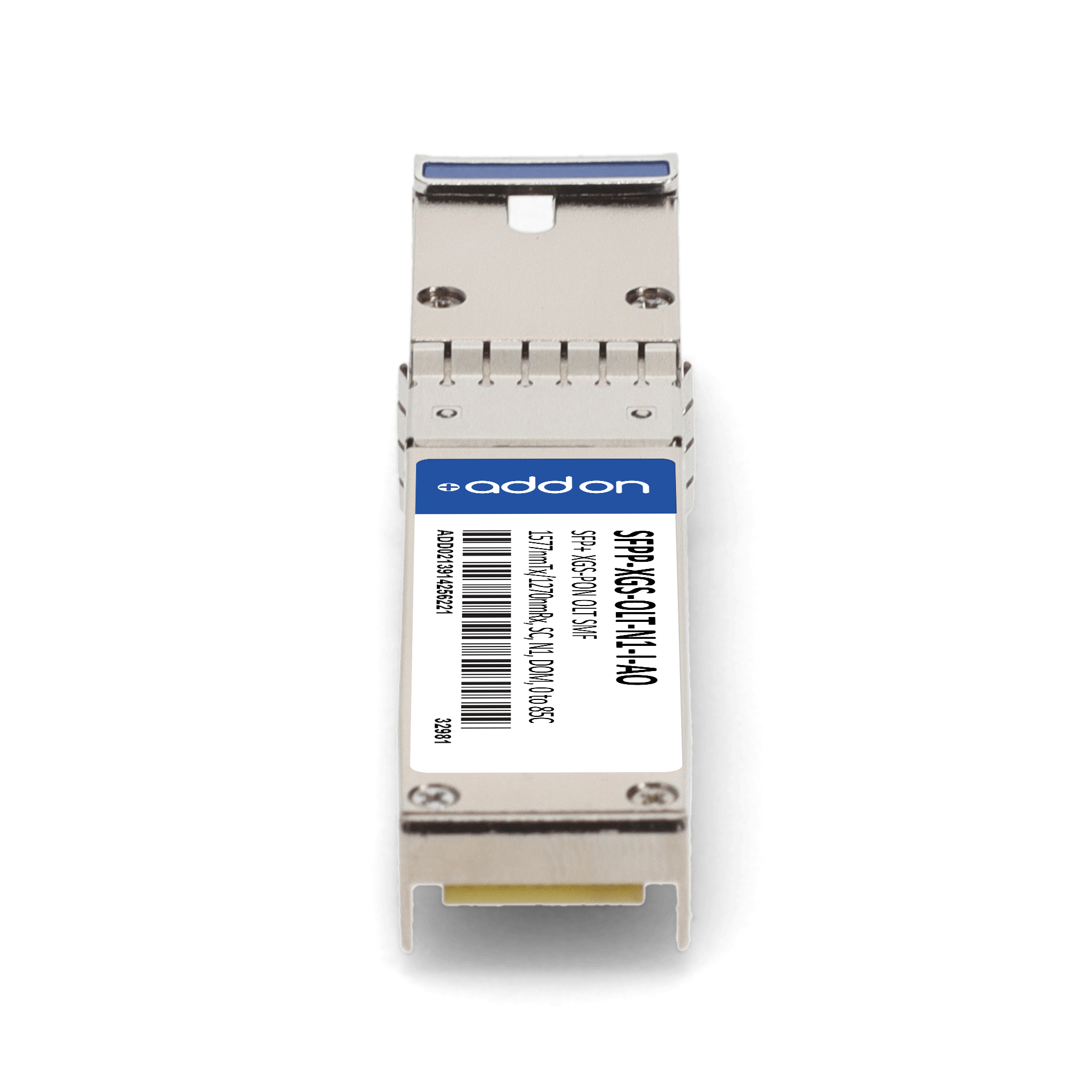 AddOn Networks SFPP-XGS-OLT-N1-I-AO. SFP transceiver type: Fiber optic, Maximum data transfer rate: 10000 Mbit/s, Interface type: SFP+. Product colour: Silver, Brand compatibility: MSA Compliant. Compliance certificates: Trade Agreements Act (TAA). Quantity per pack: 1 pc(s). Package width: 69.8 mm, Package depth: 120.6 mm, Package height: 30.5 mm |