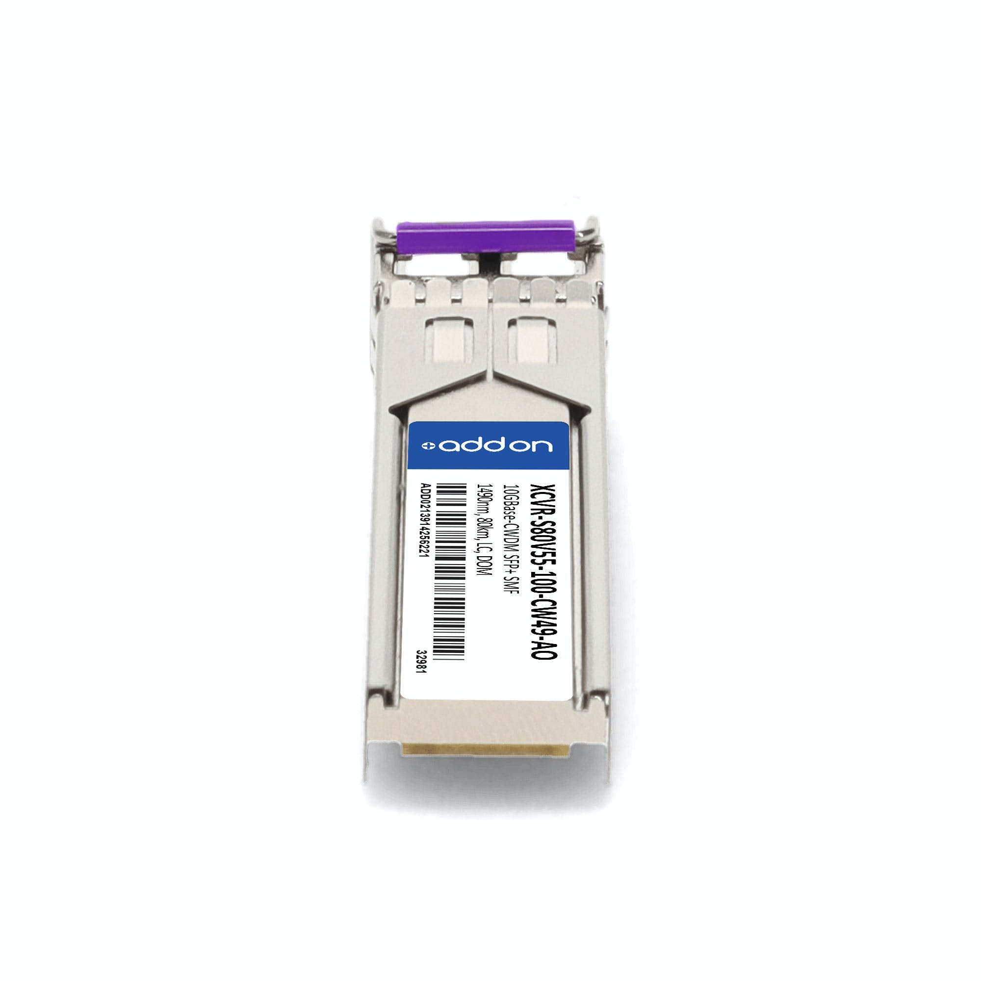 AddOn Networks XCVR-S80V55-100-CW49-AO. SFP transceiver type: Fiber optic, Maximum data transfer rate: 10000 Mbit/s, Interface type: SFP+. Product colour: Metallic, Brand compatibility: Ciena. Quantity per pack: 1 pc(s)