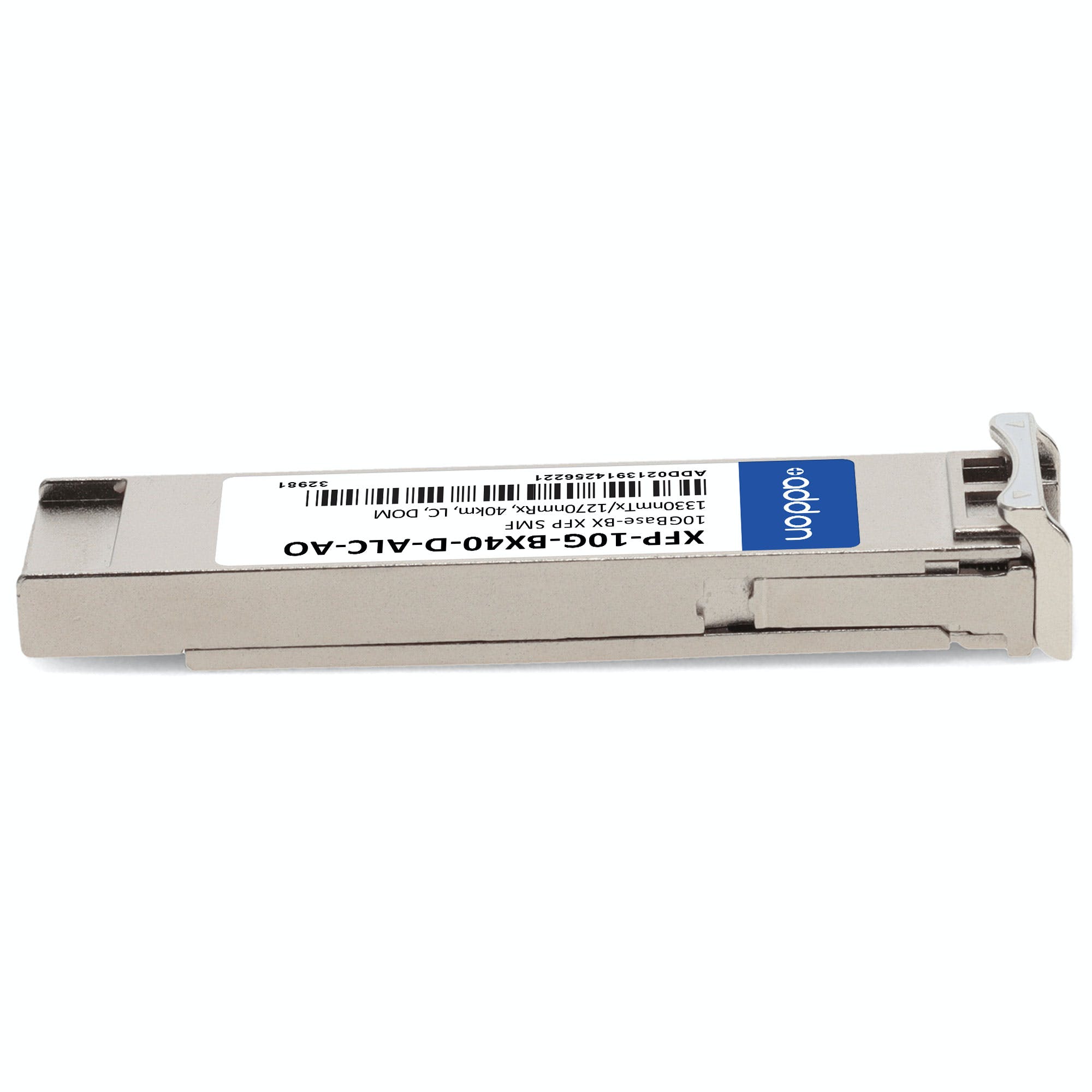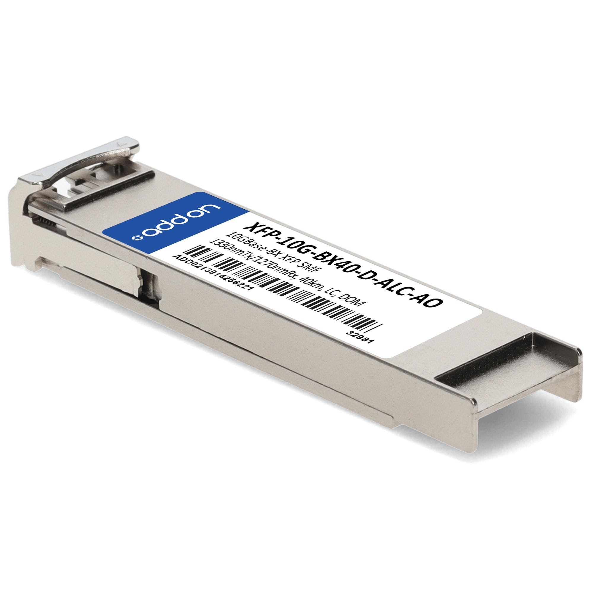AddOn Networks XFP-10G-BX40-D-ALC-AO. SFP transceiver type: Fiber optic, Maximum data transfer rate: 10000 Mbit/s, Interface type: XFP. Product colour: Metallic, Brand compatibility: Alcatel-Lucent. Quantity per pack: 1 pc(s)