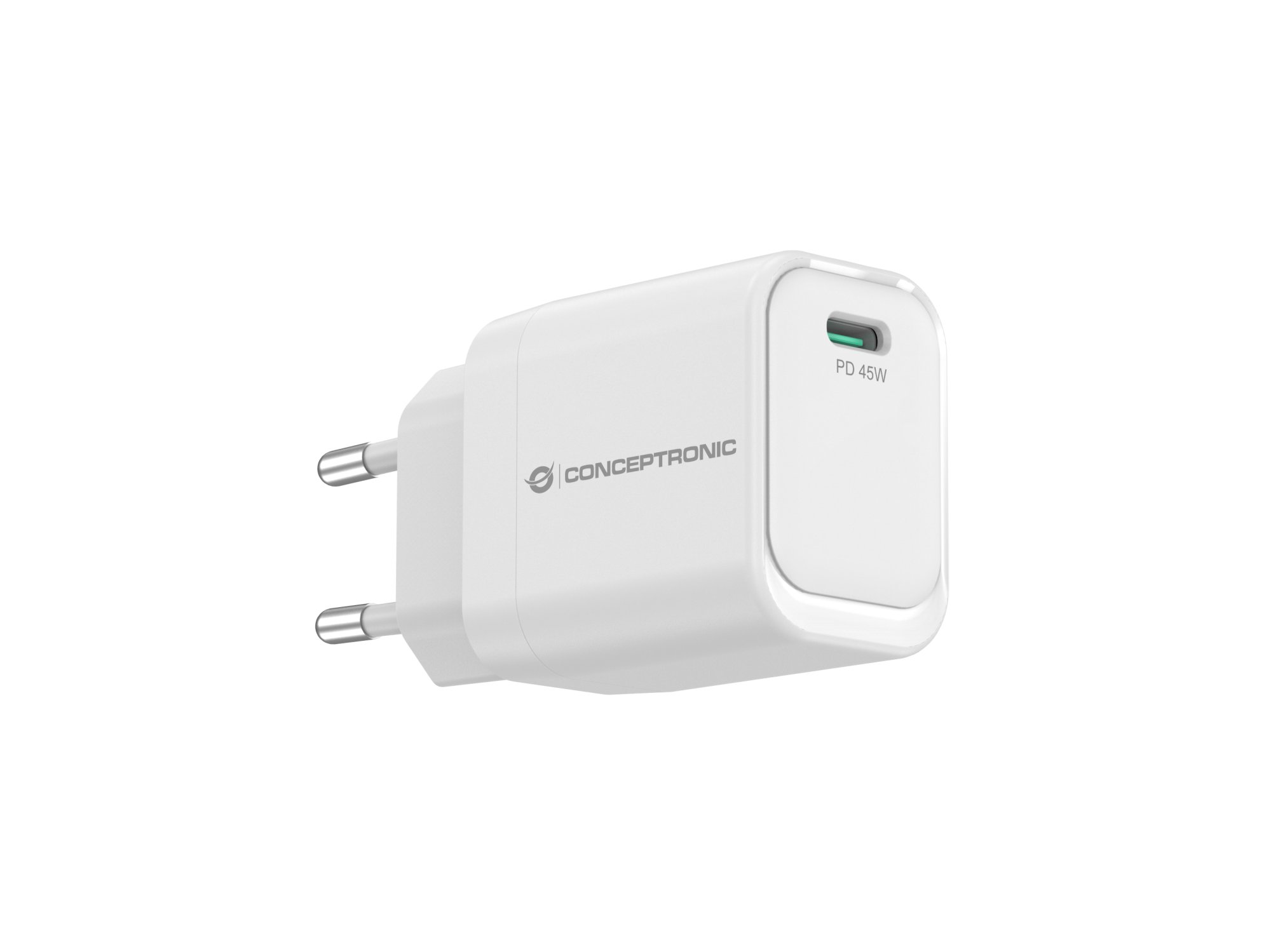 Conceptronic ALTHEA19W45 1-Port 45W GaN USB-C PD Charger, PPS, PD 3.0. Charger type: Indoor, Power source type: AC, Charger compatibility: Universal. Input voltage: 100 - 240 V. USB Type-C ports quantity: 1, Fast charging, Power protection features: Overload, Short circuit, Overheating. Product colour: White