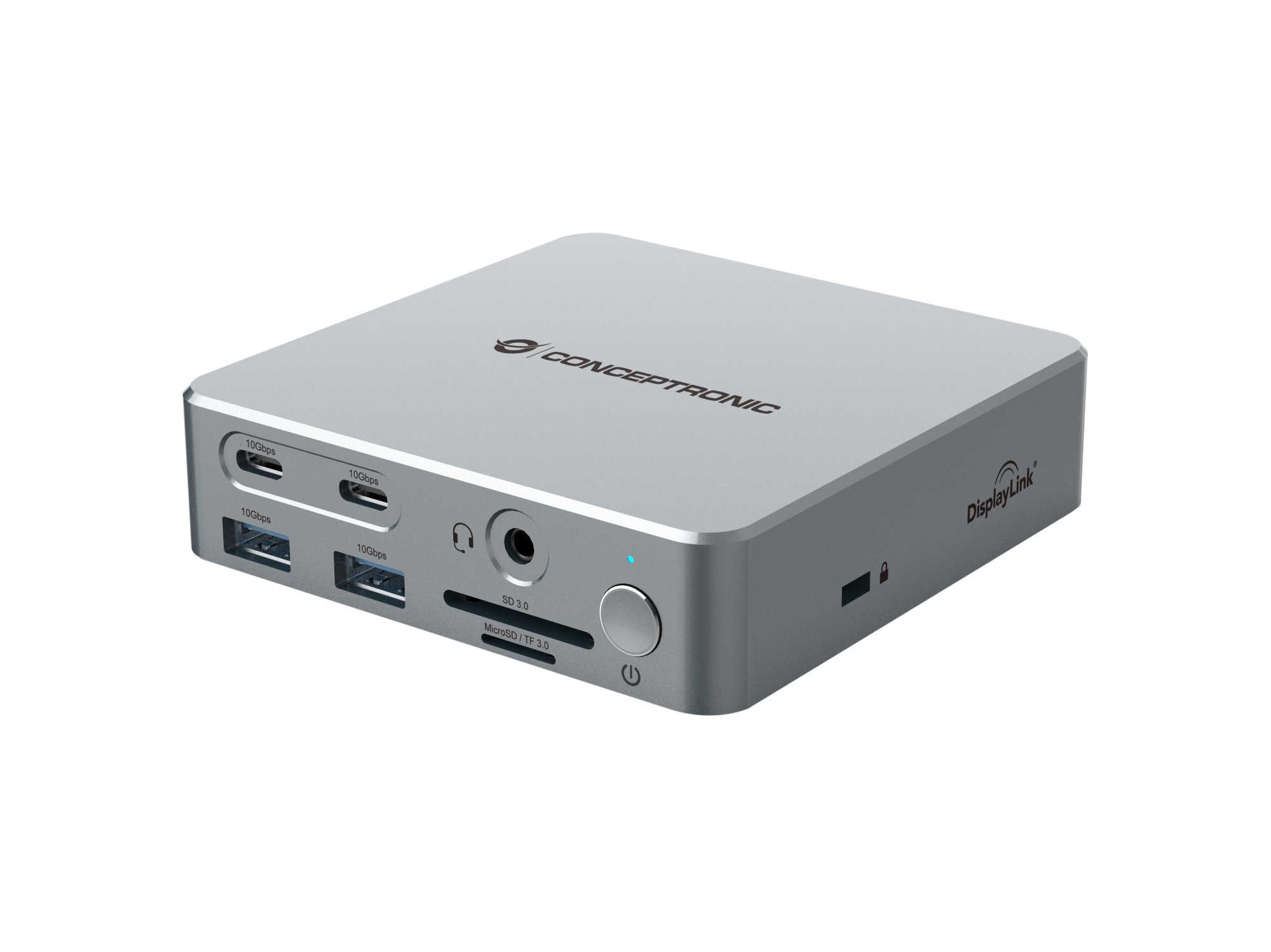 Conceptronic DONN25G 15-in-1 DisplayLink USB 3.2 Gen 2 Docking Station, Triple 4K60Hz Display, HDMI x 2, DisplayPort, USB-C 10Gbps x 2, USB-A 10Gbps x 2, USB-A 5Gbps x 2, SD, TF/MicroSD, GbE, Audio, DC in, Security Slot, PD 3.0. Connectivity technology: Wired, Host interface: USB 3.2 Gen 2 (3.1 Gen 2) Type-C, USB Power Delivery up to: 100 W. Ethernet LAN data rates: 10,100,1000 Mbit/s. Product colour: Silver, Compatible memory cards: MicroSD (TransFlash), MicroSDHC, MicroSDXC, SD, SDHC, SDXC, HD type: 4K Ultra HD. Power source type: DC. Windows operating systems supported: Windows 10, Windows 10 Education, Windows 10 Education x64, Windows 10 Enterprise, Windows 10..., Mac operating systems supported: Mac OS X 10.10 Yosemite, Mac OS X 10.11 El Capitan, Mac OS X 10.12 Sierra, Mac OS X 10.13 High..., Mobile operating systems supported: Android 10.0, Android 11.0, Android 12.0, Android 13.0, Android 5.0, Android 5.1, Android 6.0,...