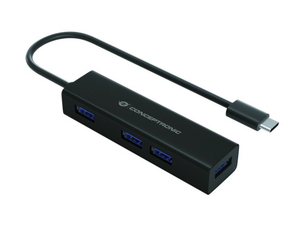 Conceptronic HUBBIES USB-C to 4-Port USB 3.0 Hub. Host interface: USB 3.2 Gen 1 (3.1 Gen 1) Type-C, Hub interfaces: USB 3.2 Gen 1 (3.1 Gen 1) Type-A. Data transfer rate: 5000 Mbit/s, Product colour: Black, Housing material: Aluminium. Width: 87.5 mm, Depth: 23.4 mm, Height: 16.5 mm. Quantity per pack: 1 pc(s), Package width: 112.5 mm, Package depth: 24.5 mm
