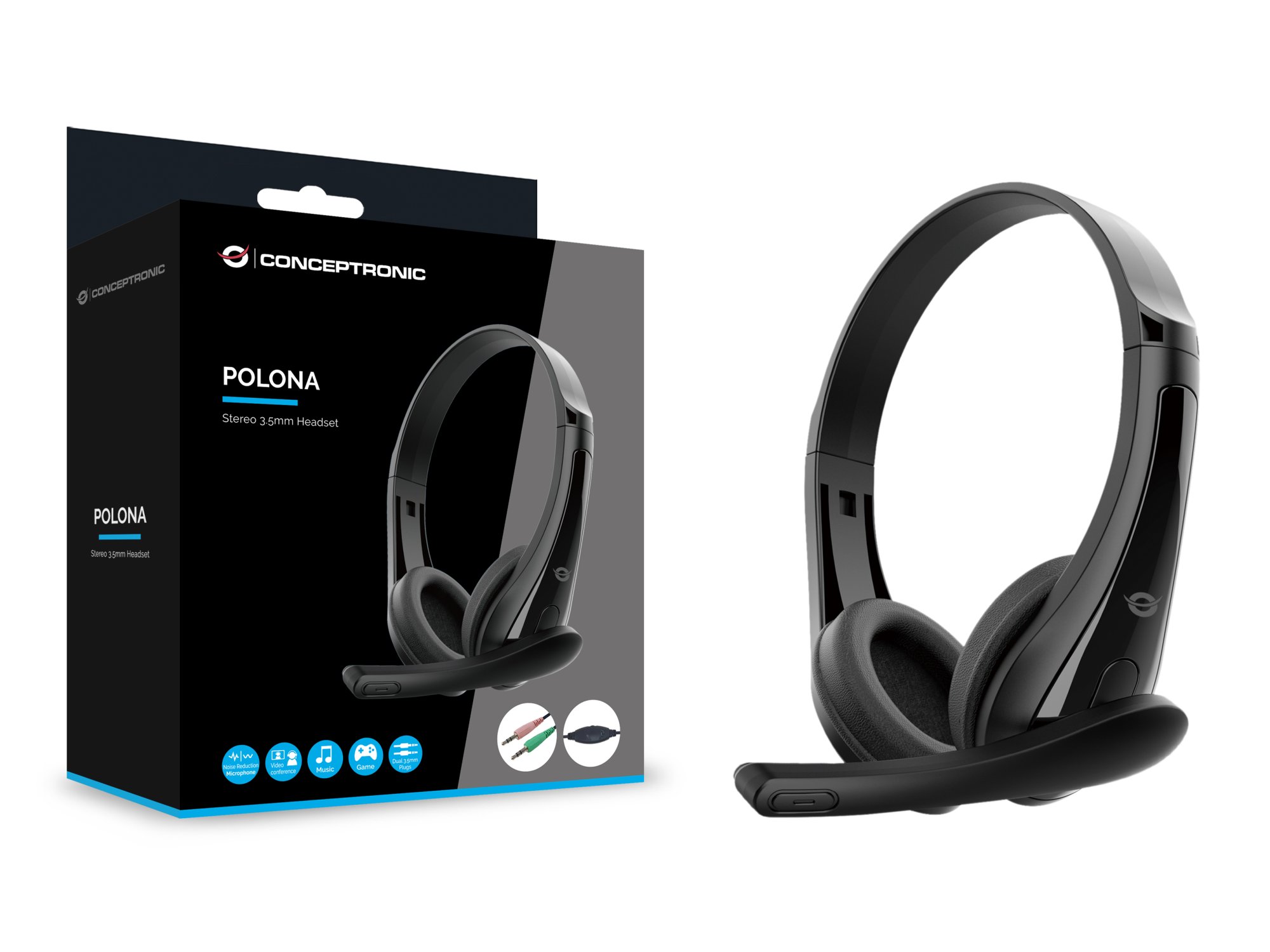 Conceptronic POLONA06B3T Stereo 3.5mm Headset, Noise Reduction Microphone. Product type: Headset. Connectivity technology: Wired. Recommended usage: Calls/Music. Headphone frequency: 20 - 20000 Hz. Cable length: 1.8 m. Weight: 100 g. Product colour: Black