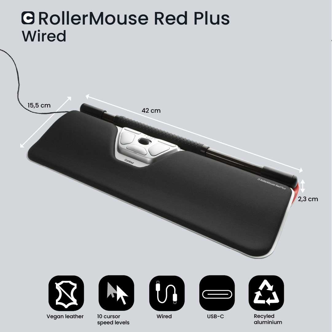 Contour Design RollerMouse Red Plus, wired. Movement detection technology: Rollerbar, Device interface: USB Type-C, Movement resolution: 2800 DPI, Buttons type: Pressed buttons, Buttons quantity: 6, Scroll type: Wheel/Rollerbar. Power source: Cable. Product colour: Black, Silver