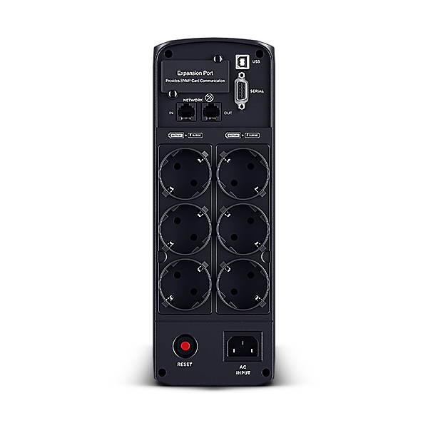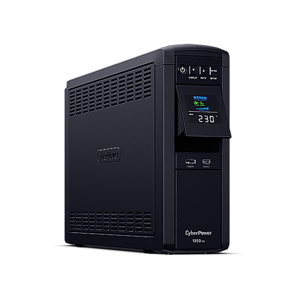 CyberPower CP1350EPFCLCD. UPS topology: Line-Interactive, Output power capacity: 1.35 kVA, Output power: 780 W. AC outlet types: Type F, Power plug: C14 coupler, AC outlets quantity: 6 AC outlet(s). Battery capacity: 8.5 Ah, Battery voltage: 12 V, Typical backup time at full load: 4 min. Form factor: Tower, Product colour: Black, Cooling type: Passive. Compliance certificates: RoHS
