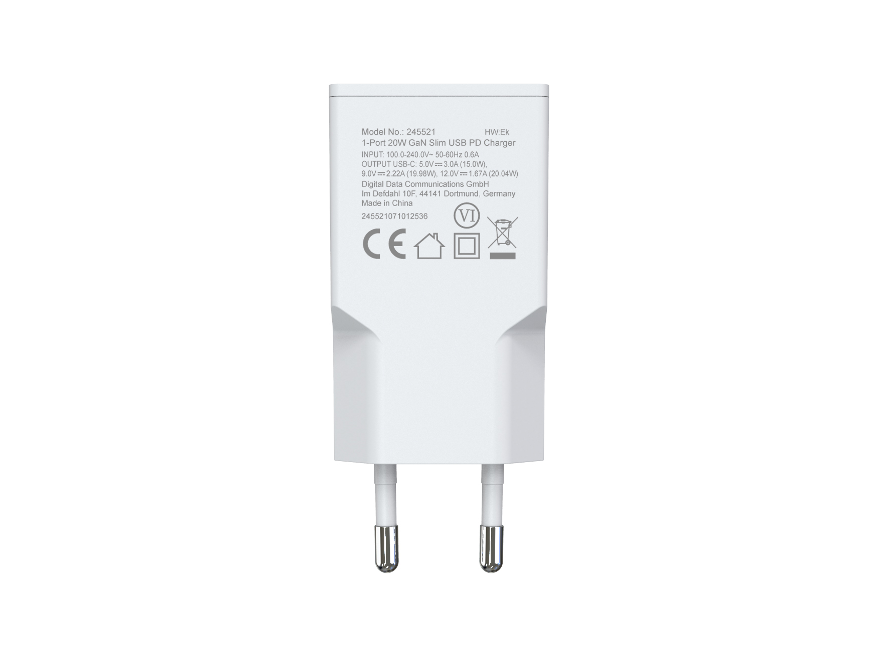 Equip 1-Port 20W GaN Slim USB-C PD Charger. Charger type: Indoor, Power source type: AC, Charger compatibility: Universal. Input voltage: 100 - 240 V, Maximum output voltage: 12 V. USB Type-C ports quantity: 1, Fast charging, Power protection features: Over current, Over voltage, Overload, Short circuit. Product colour: White