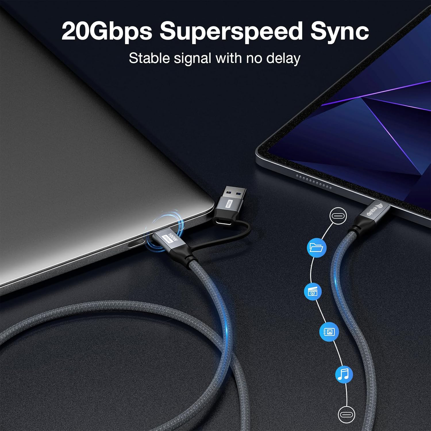 - 20Gbps (USB-C to C), 10Gpbs (USB-A to C) data transfer rate