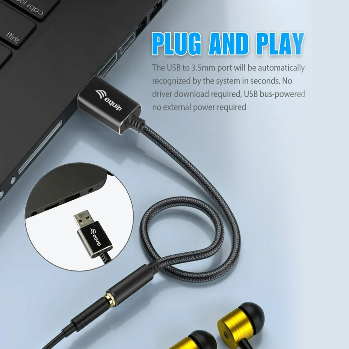 Equip 147945. Connector 1: 3.5mm, Connector 1 gender: Female, Connector 2: USB Type-A, Connector 2 gender: Male, Cable length: 0.15 m, Product colour: Black