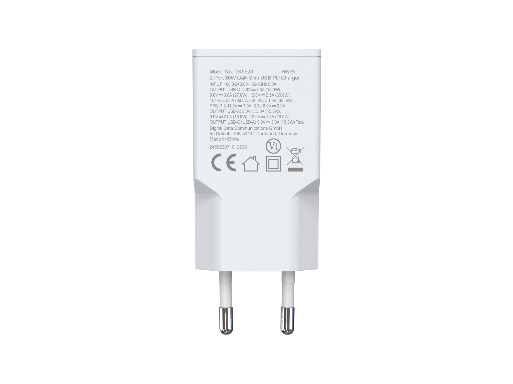 Equip 2-Port 30W GaN Slim USB PD Charger, USB-C x1, USB-A x1. Charger type: Indoor, Power source type: AC, Charger compatibility: Universal. Input voltage: 100 - 240 V, Maximum output voltage: 20 V. USB 2.0 ports quantity: 1, USB Type-C ports quantity: 1, Fast charging, Power protection features: Over current, Over voltage, Overload, Short circuit. Product colour: White
