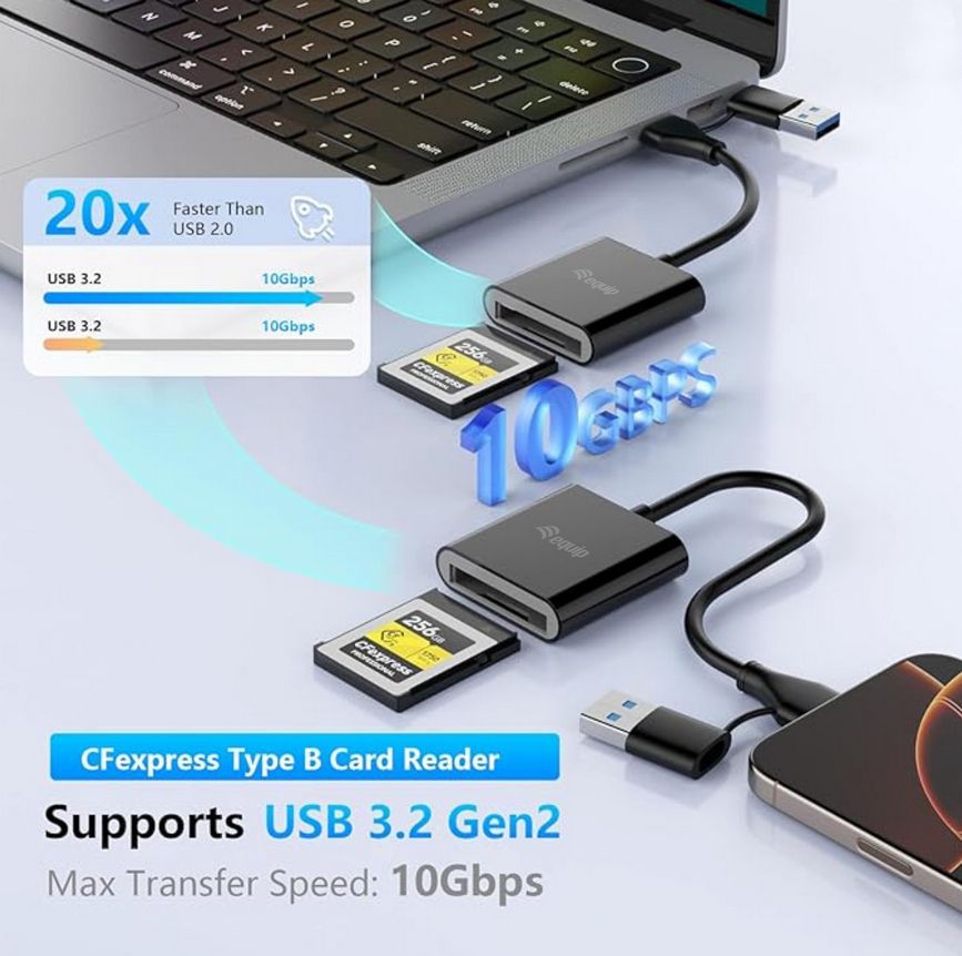 Equip 245461. Compatible memory cards: CFexpress 2.0 Type B, Product colour: Black, Data transfer rate: 10000 Mbit/s. Interface: USB 3.2 Gen 2 (3.1 Gen 2) Type-C. Width: 38.6 mm, Depth: 11 mm, Height: 40 mm. Quantity per pack: 1 pc(s). Write speed: 900 MB/s, Read speed: 900 MB/s