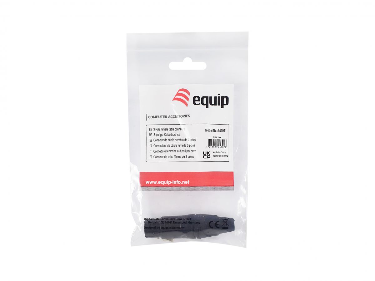 Equip 3-Pole female cable connector, Black. Connector(s): 3-Pole XLR, Product colour: Black, Connector gender: Female. Compliance certificates: CE, RoHS. Weight: 30.5 g, Width: 19.2 mm, Depth: 19.2 mm. Quantity per pack: 1 pc(s), Package width: 100 mm, Package depth: 19.3 mm. Country of origin: China, Master (outer) case width: 450 mm, Master (outer) case length: 300 mm