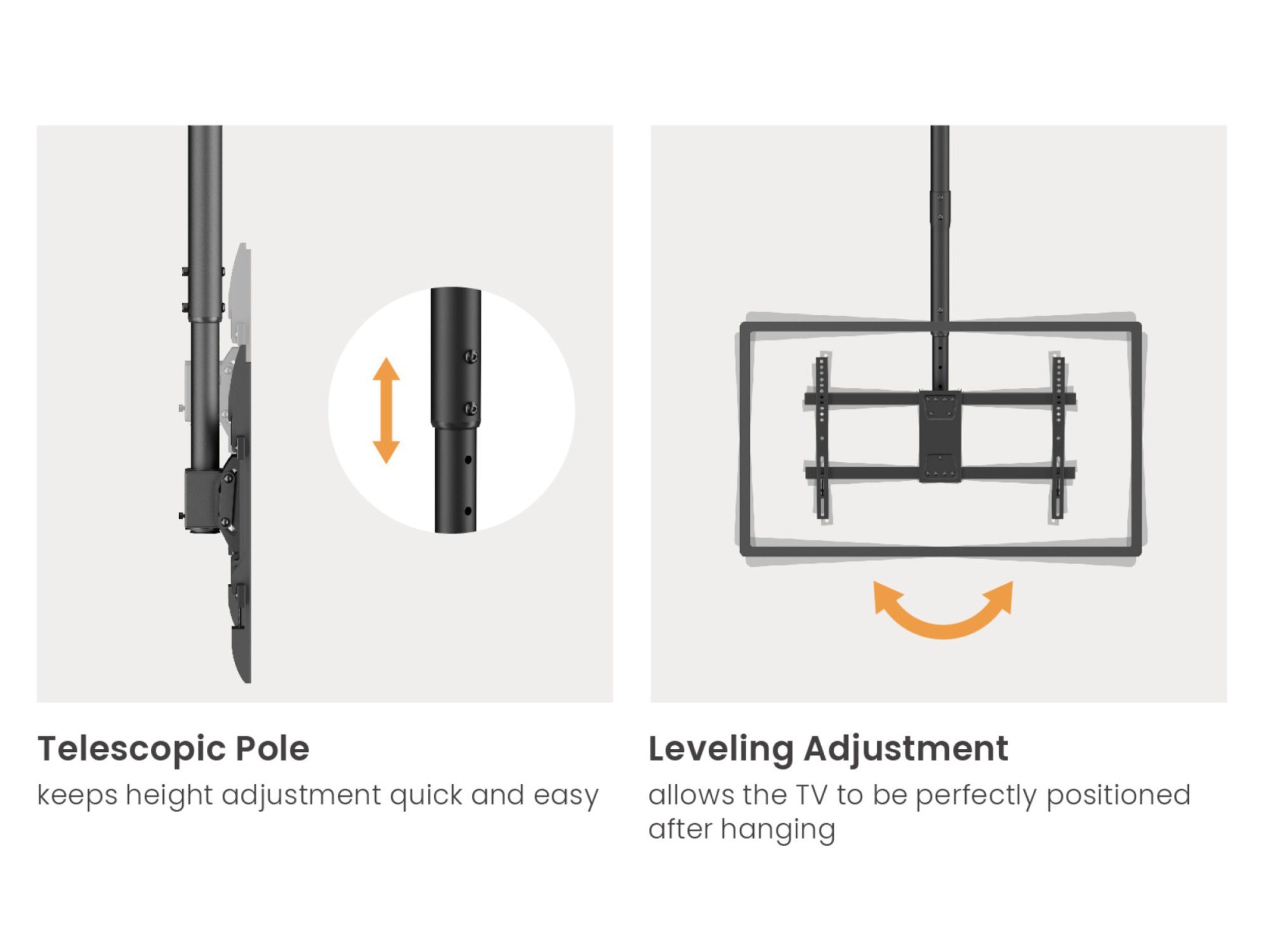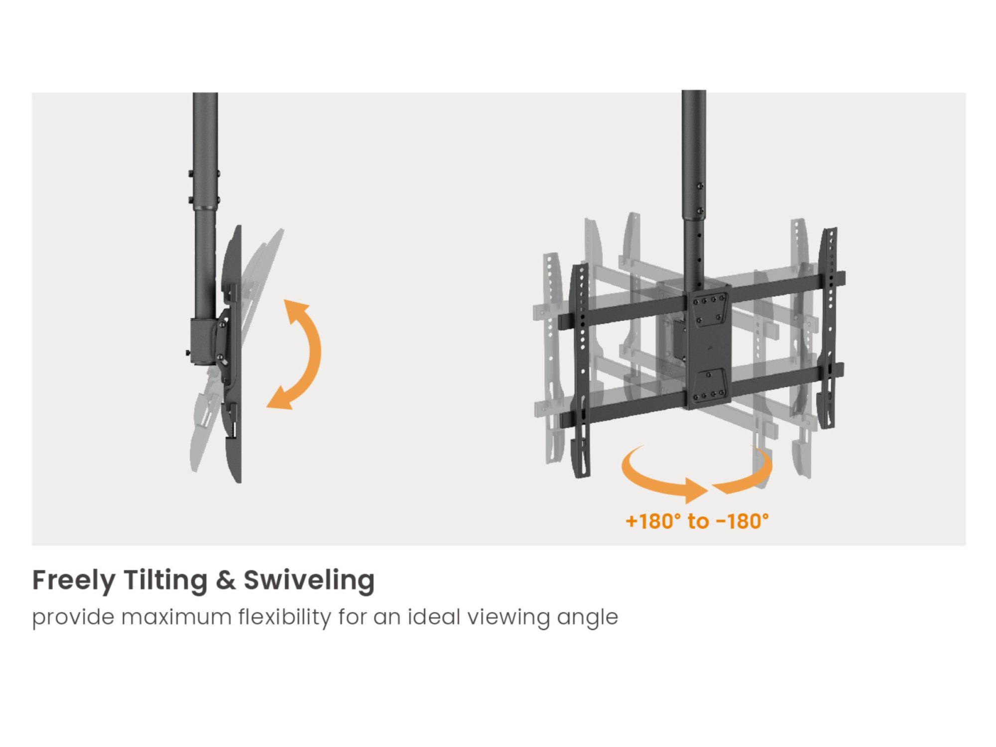 Equip 32"-60" Dual Screen Ceiling Mount. Maximum weight capacity: 80 kg, Minimum screen size: 81.3 cm (32"), Maximum screen size: 152.4 cm (60"), Minimum VESA mount: 200 x 200 mm, Maximum VESA mount: 600 x 400 mm. Swivel angle range: -180 - 180°. Product colour: Black