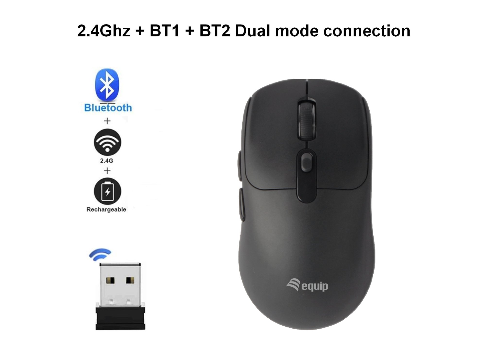 Equip 6-Button Dual Mode Wireless mouse. Form factor: Ambidextrous. Movement detection technology: Optical, Device interface: RF Wireless + Bluetooth, Movement resolution: 1600 DPI, Buttons type: Pressed buttons, Buttons quantity: 6, Scroll type: Wheel. Power source: Batteries. Product colour: Black