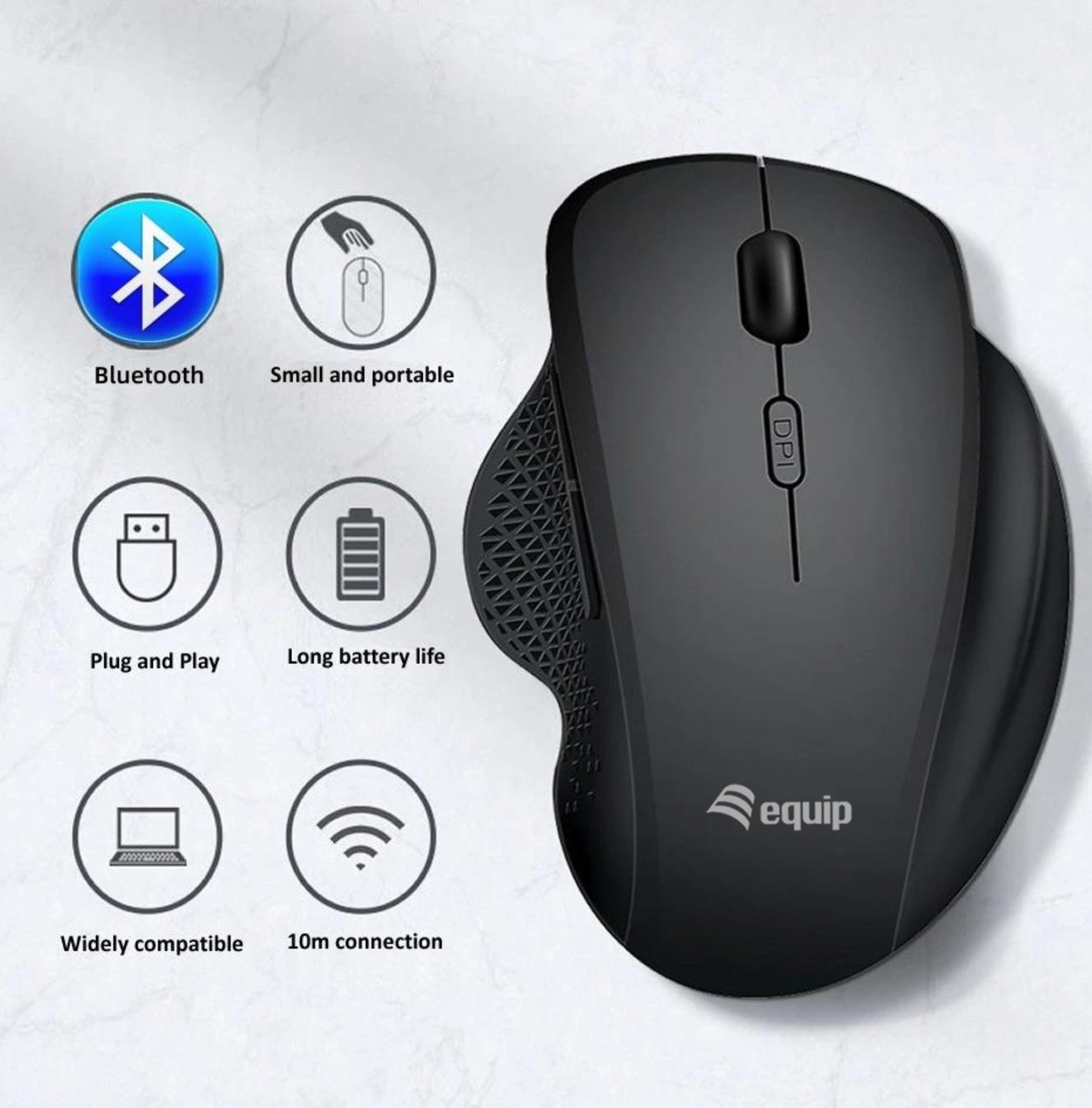 Equip 6-Button Dual Mode Wireless mouse, Rechargeable. Form factor: Right-hand. Movement detection technology: Optical, Device interface: RF Wireless + Bluetooth, Movement resolution: 1600 DPI, Buttons type: Pressed buttons, Buttons quantity: 6, Scroll type: Wheel. Power source: Batteries. Product colour: Black