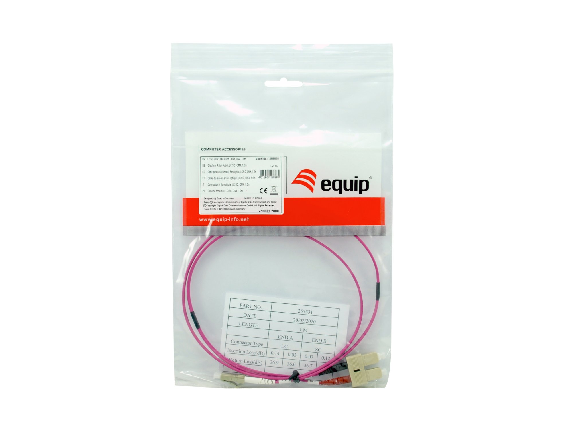 Equip LC/SC Fiber Optic Patch Cable, OM4, 7.0m. Cable length: 7 m, Fibre optic type: OM4, Connector 1: LC, Connector 2: SC, Core diameter: 50 µm, Full duplex