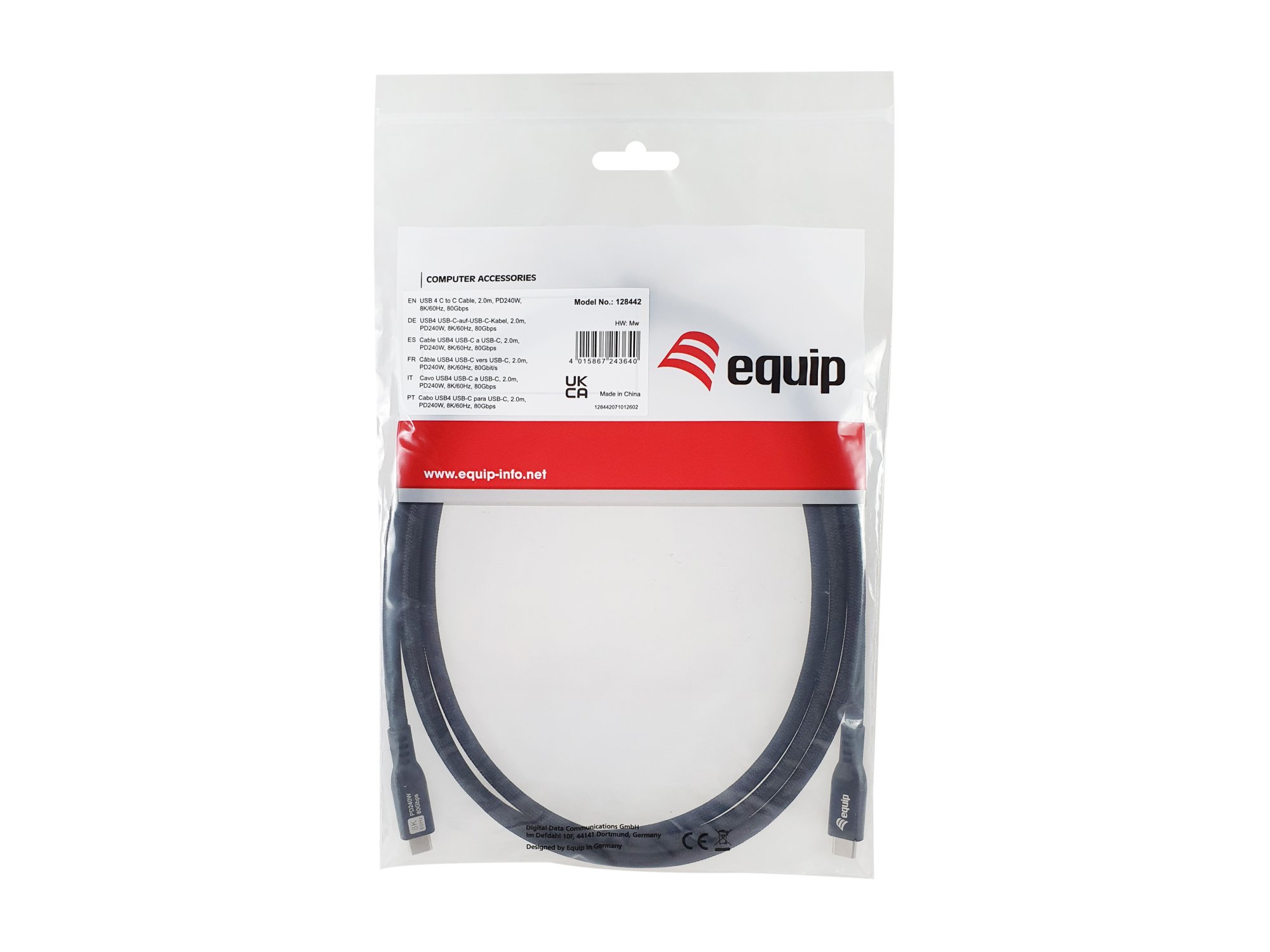 Equip USB 4 C to C Cable, 2m, PD240W, 8K/60Hz, 80Gbps, Black. Cable length: 2 m. Connector 1: USB C, Connector 2: USB C, USB version: USB4 Gen 4x2, Maximum data transfer rate: 80 Gbit/s, Product colour: Black