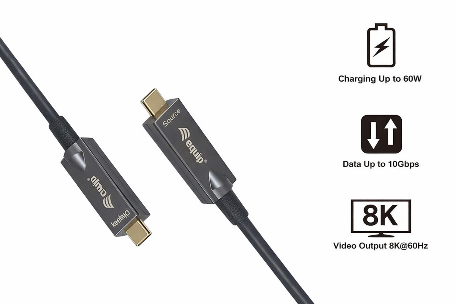 Equip USB-C to C Active Optical Cable, 15m, PD 60W, 8K/60Hz, 10Gbps, Video+Data+PD. Cable length: 15 m. Connector 1: USB C, Connector 2: USB C, USB version: USB 3.2 Gen 2 (3.1 Gen 2), Maximum data transfer rate: 10 Gbit/s, Connector contacts plating: Gold, Product colour: Black