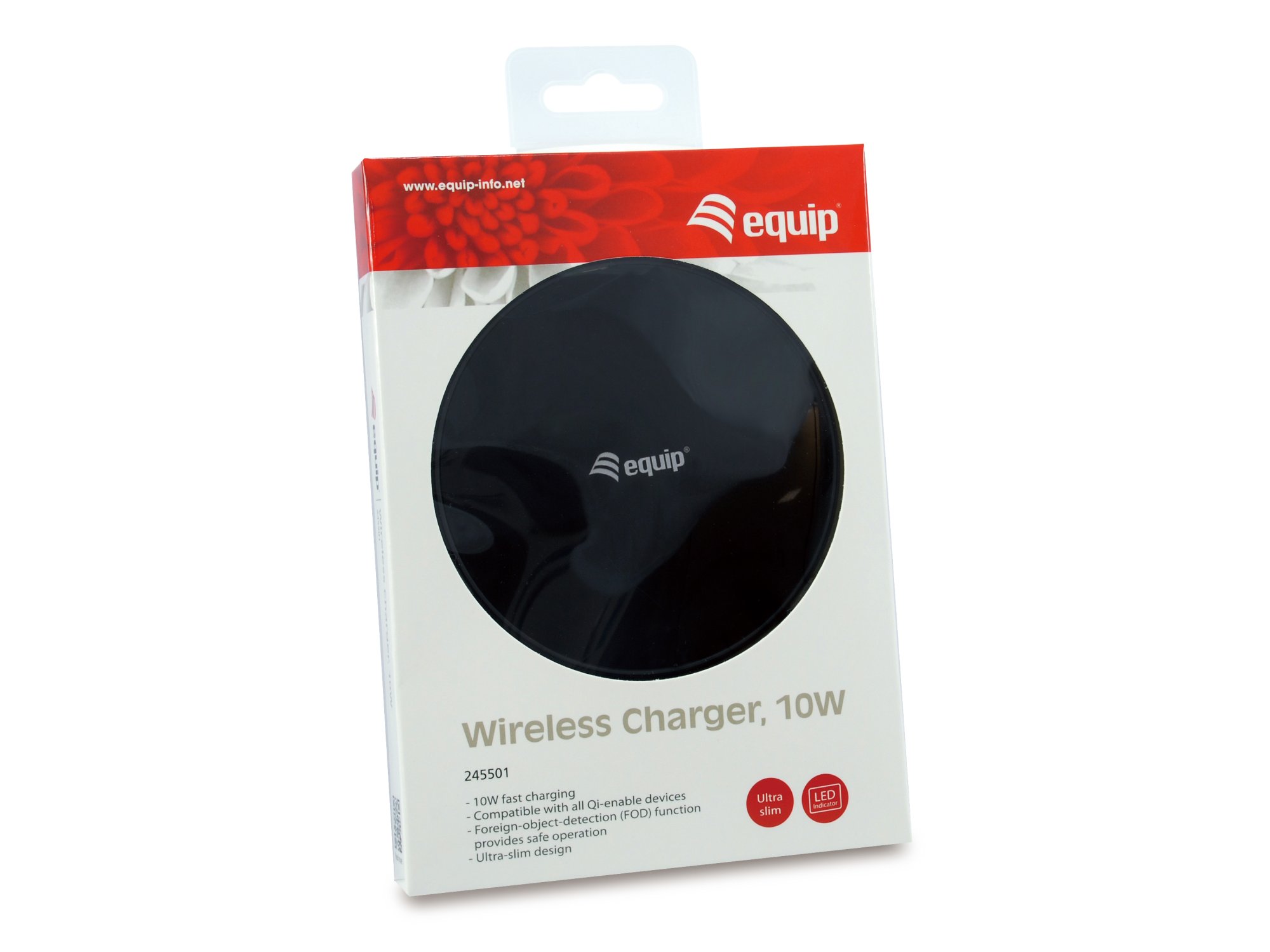 Equip Wireless Charger, 10W. Charger type: Indoor, Power source type: USB, Charger compatibility: Universal. Input voltage: 9 V. Wireless charging. Product colour: Black