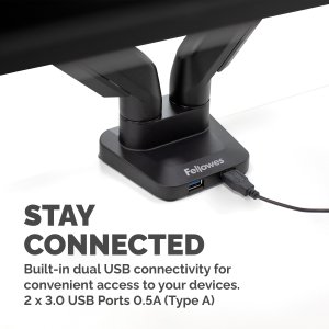 - BUILT-IN USB PORTS - Built in dual USB connectivity and intuitive cable management allows you to stay connected and minimise clutter at the same time with the Fellowes Platinum Series dual monitor arm