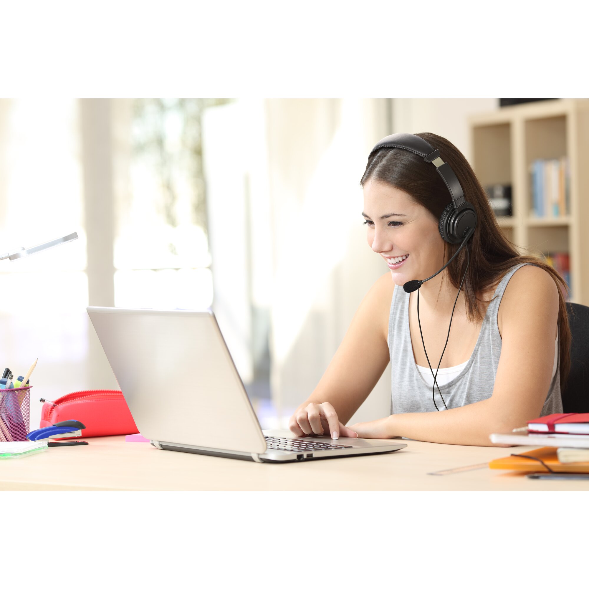 • Designed to fit all ages for universal comfort, the adjustable headband is padded and the flexible boom-style microphone can be rotated up to 270°. The foam ear pads are wrapped in a soft leatherette cover to provide hours of comfortable use.
