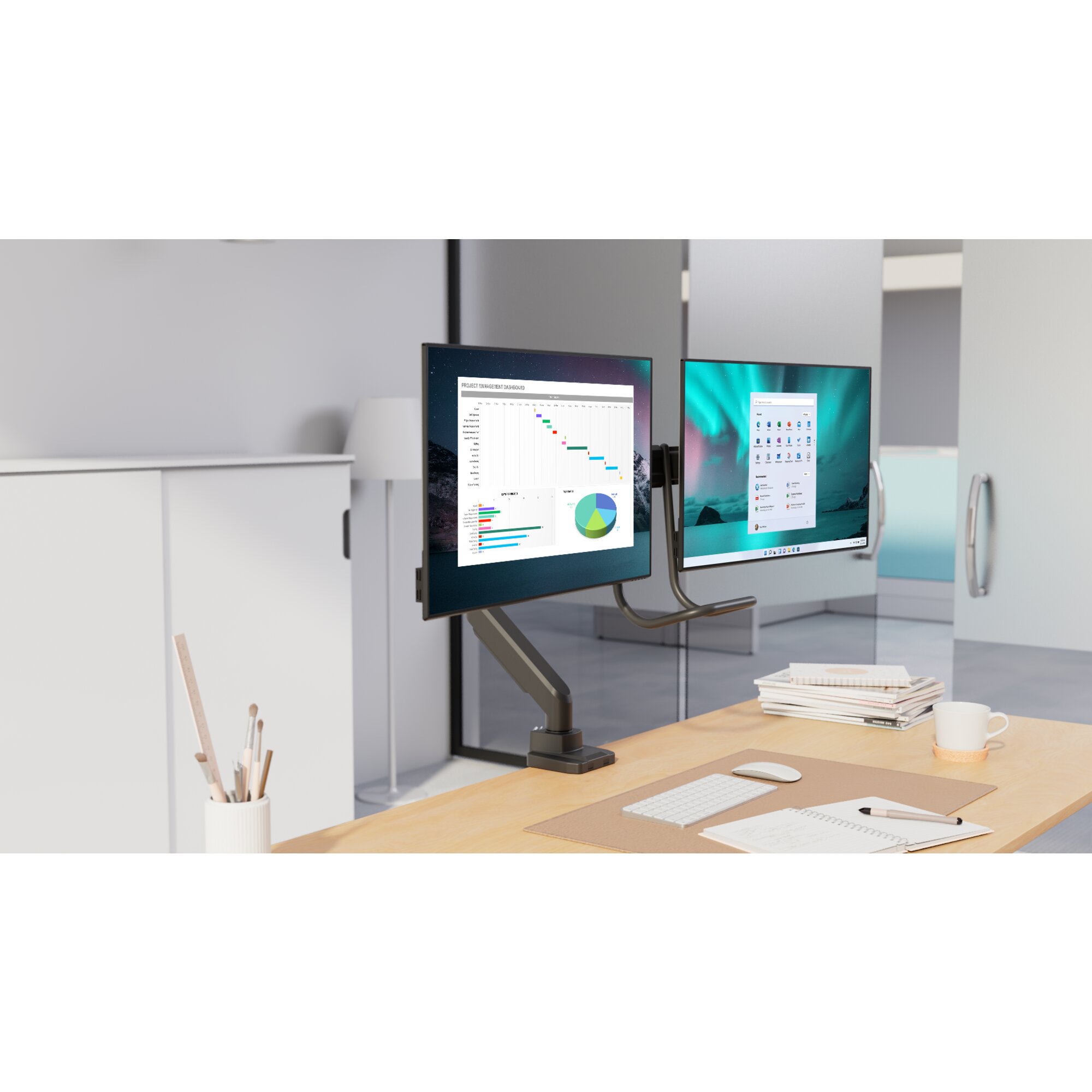 - Supports separate horizontal adjustments for each monitor for more comfortable viewing.