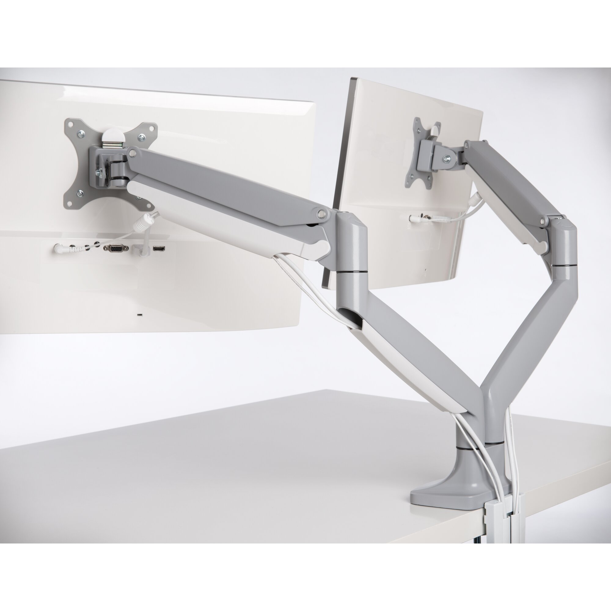 Kensington SmartFit One-Touch Height-Adjustable Dual Monitor Arm. Mounting: Bolt-through, Maximum weight capacity: 9 kg, Minimum screen size: 33 cm (13"), Maximum screen size: 81.3 cm (32"), Maximum VESA mount: 100 x 100 mm. Tilt angle range: 90 - 90°. Product colour: Silver