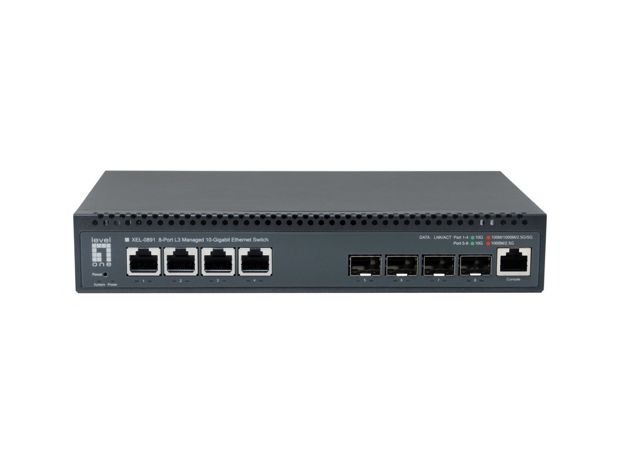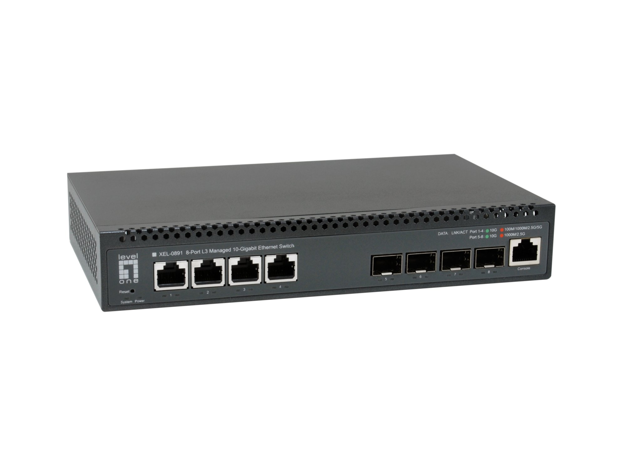 LevelOne 8-Port L3 Managed 10-Gigabit Switch, 4 x 1G/2.5G/5G/10G RJ45, 4 x 1G/2.5G/10G SFP+ Uplinks. Switch type: Managed, Switch layer: L3. Basic switching RJ-45 Ethernet ports type: 10G Ethernet (100/1000/10000), Basic switching RJ-45 Ethernet ports quantity: 4, Console port: RJ-45. Full duplex. MAC address table: 16000 entries, Switching capacity: 160 Gbit/s. Networking standards: IEEE 802.3, IEEE 802.3u, IEEE 802.3ab, IEEE 802.3x, IEEE 802.3az, IEEE 802.3ae, IEEE 802.1Q, IEEE.... DC input voltage: 12 V. Power connector: DC-in jack. Form factor: Desktop