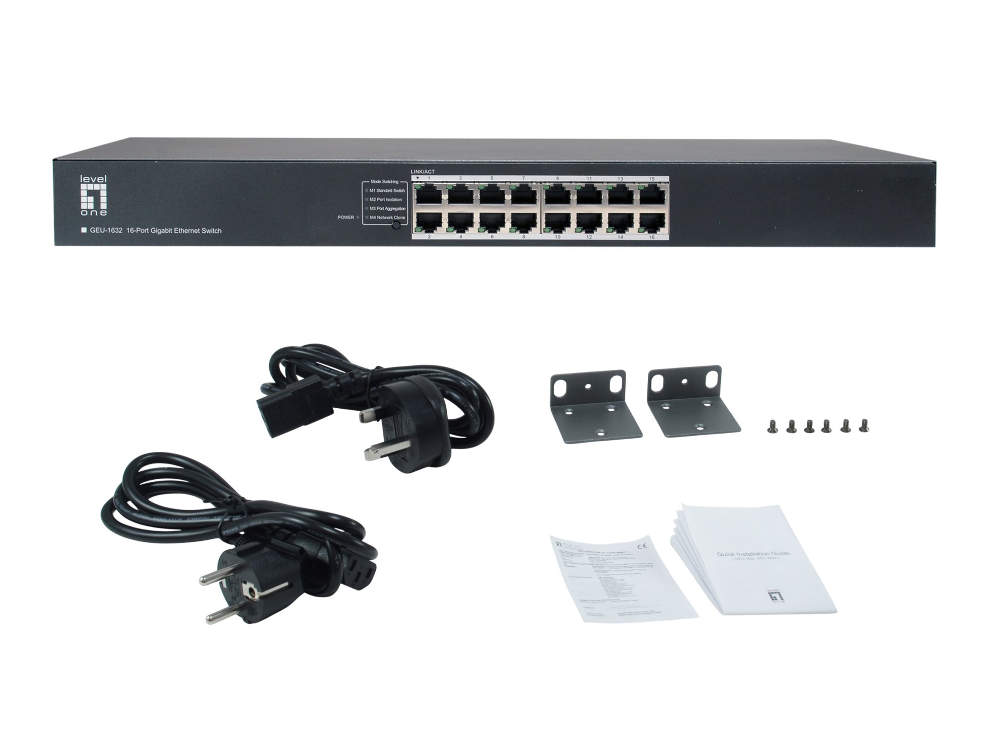 LevelOne GEU-1632 16-Port Gigabit Ethernet Switch, 4-Mode DIP Button, 19" Rackmount Unmanaged Switch. Switch type: Unmanaged. Basic switching RJ-45 Ethernet ports type: Gigabit Ethernet (10/100/1000), Basic switching RJ-45 Ethernet ports quantity: 16. MAC address table: 8000 entries, Switching capacity: 32 Gbit/s. Networking standards: IEEE 802.3, IEEE 802.3u, IEEE 802.3ab. Power connector: AC-in jack. Rack mounting, Form factor: 1U
