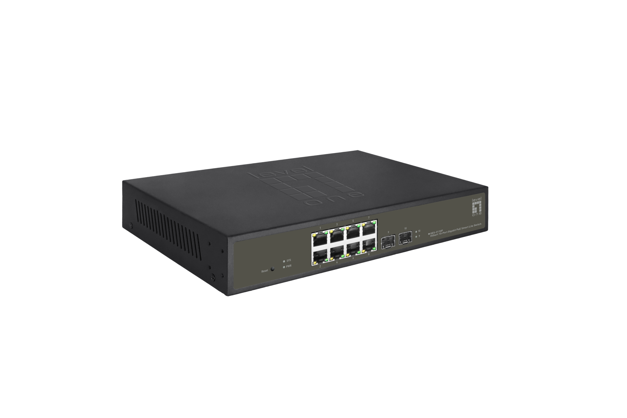 LevelOne Hilbert 10-Port Gigabit PoE Smart Lite Switch, 8 PoE Outputs, 2 x Gigabit SFP, 802.3at/af PoE, 130W PoE Power Budget. Switch type: Managed, Switch layer: L2. Basic switching RJ-45 Ethernet ports type: Gigabit Ethernet (10/100/1000), Basic switching RJ-45 Ethernet ports quantity: 8. Full duplex. MAC address table: 8000 entries, Switching capacity: 20 Gbit/s. Networking standards: IEEE 802.1Q, IEEE 802.1p, IEEE 802.3, IEEE 802.3ab, IEEE 802.3af, IEEE 802.3at, IEEE 802.3az, IEEE.... Power over Ethernet (PoE)