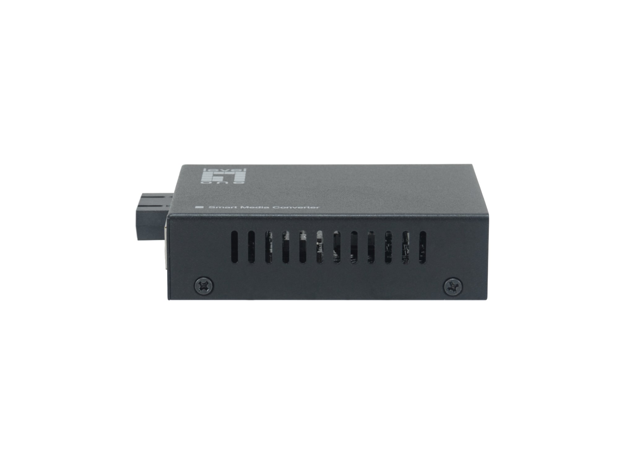 LevelOne Smart Gigabit RJ45-SC Media Converter, Single-Mode Fiber, 1310nm, 20km, Compatible with 19-inch rack-mountable chassis. Maximum data transfer rate: 1000 Mbit/s, Converter input interface: 10Base-T, 100Base-T, 1000Base-T, Networking standards: IEEE 802.1Q, IEEE 802.1p, IEEE 802.3, IEEE 802.3ab, IEEE 802.3az, IEEE 802.3u. Maximum transfer distance: 20000 m, Wavelength: 1310 nm, Fiber mode structure: Single-mode. LED indicators: Activity, Link, Power, Product colour: Black. Fiber optic connector: SC, Connectivity technology: Wired. Output voltage: 5 V, Output current: 2 A, Power consumption (typical): 10 W