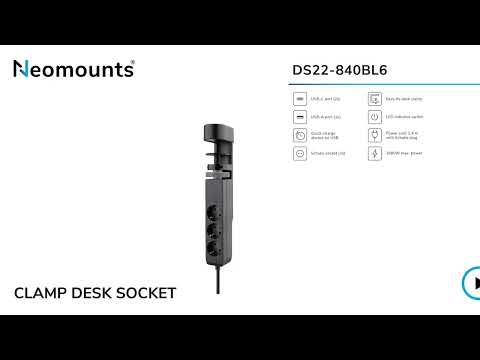 Neomounts DS22-840BL6 Desk socket with clamp and USB-C and USB-A ports - Quick charge. Cable length: 1.4 m, Placement supported: Indoor, Power plug type: Type F. AC outlets quantity: 3 AC outlet(s). Maximum input power: 20 W. Width: 58 mm, Depth: 98 mm, Height: 34 mm. Package width: 105 mm, Package depth: 65 mm, Package height: 38.5 mm