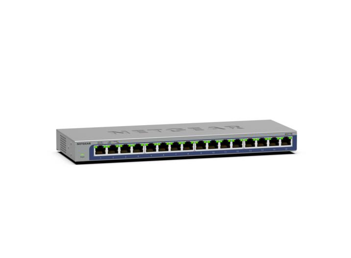 NETGEAR GS116. Switch type: Unmanaged, Switch layer: L2. Basic switching RJ-45 Ethernet ports type: Gigabit Ethernet (10/100/1000), Basic switching RJ-45 Ethernet ports quantity: 16. Networking standards: IEEE 802.3i, IEEE 802.3u, IEEE 802.3x, IEEE 802.3z. Power connector: DC-in jack